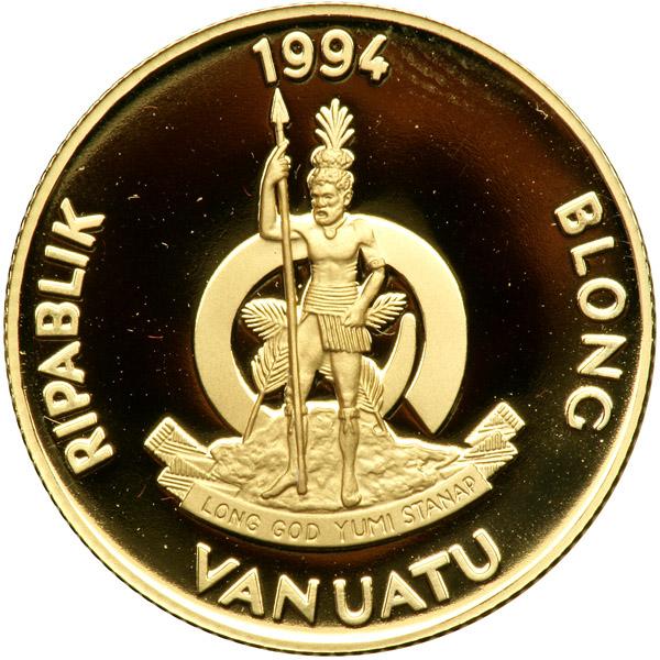Vanuatu. 100 Vatu, 1994. Fr-2; KM-23. Weight 0.1457 ounce. Former New Hebrides. Mintage 2,000 Est. Arms. Reverse: Kingfisher. Choice Brilliant Proof.