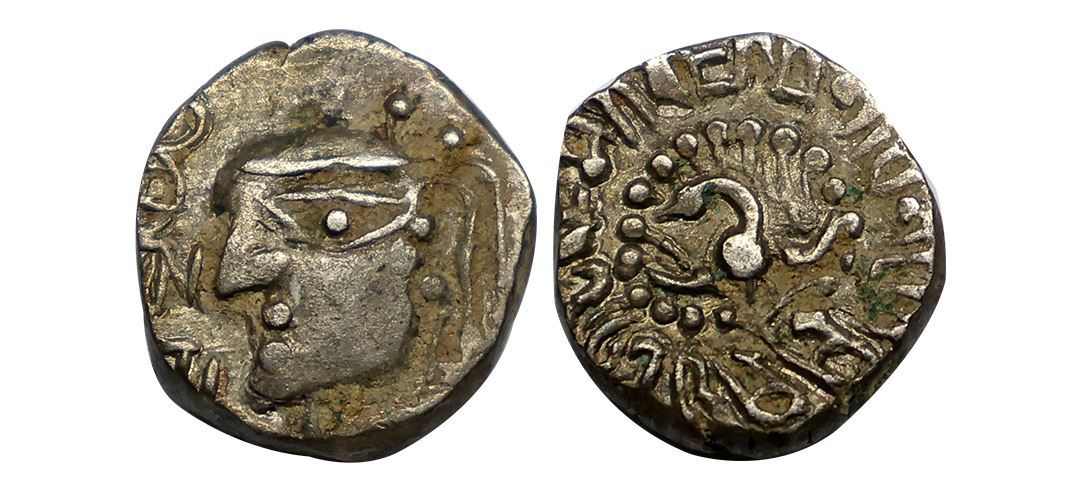 Vardhanas of Thaneswar and Kanauj, Shiladitya Harshavardhana (c. 606-647AD), Silver Drachm, 2.32 gms, Obv: king's bust in Maukhari style to left, Rev:Garuda in centre with the rulers name and titles around in Brahmi ‘vijitavanir avanapati sri shiladitya divam jayati’, Mitch ACW # 4933-37, extremely fine for the type, very rare.