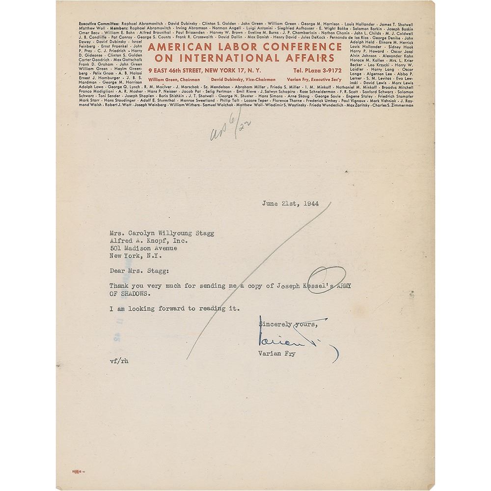 Rare World War II-dated TLS, one page, 8.5 x 11, American Labor Conference on International Affairs letterhead, June 21, 1944. Brief letter to Carolyn Willyoung Stagg of Alfred A. Knopf, Inc., in full: "Thank you very much for sending me a copy of Joseph Kessel's Army of Shadows. I am looking forward to reading it." In fine condition, with some light edge creasing, and light show-through from a stamped date notation on the back.