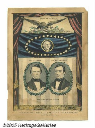 <B>Variation of Pierce and King Grand National Banner Print</B></I> 10" x 14" hand-colored small folio lithograph published by Nathaniel Currier in 1852, titled "Grand, National, Democratic Banner. Press Onward." It pictures the Democratic nominees, Franklin Pierce and William King. Following the Compromise of 1850, anxiety existed regarding the continuation of the Union. This print shows George Washington and has the slogans: "In Union Is Strength. The Union Must and Shall Be Preserved - 'Jackson' [and] The Union Now and Forever." Colors are strong, including emerald, blue, yellow, deep rose and kelly green. There is light toning and dampstaining mainly along the bottom third and sides, not affecting the portraits. Currier issued two versions of the Democratic Grand National Banner in 1852, both of which are currently offered. Lot:256
