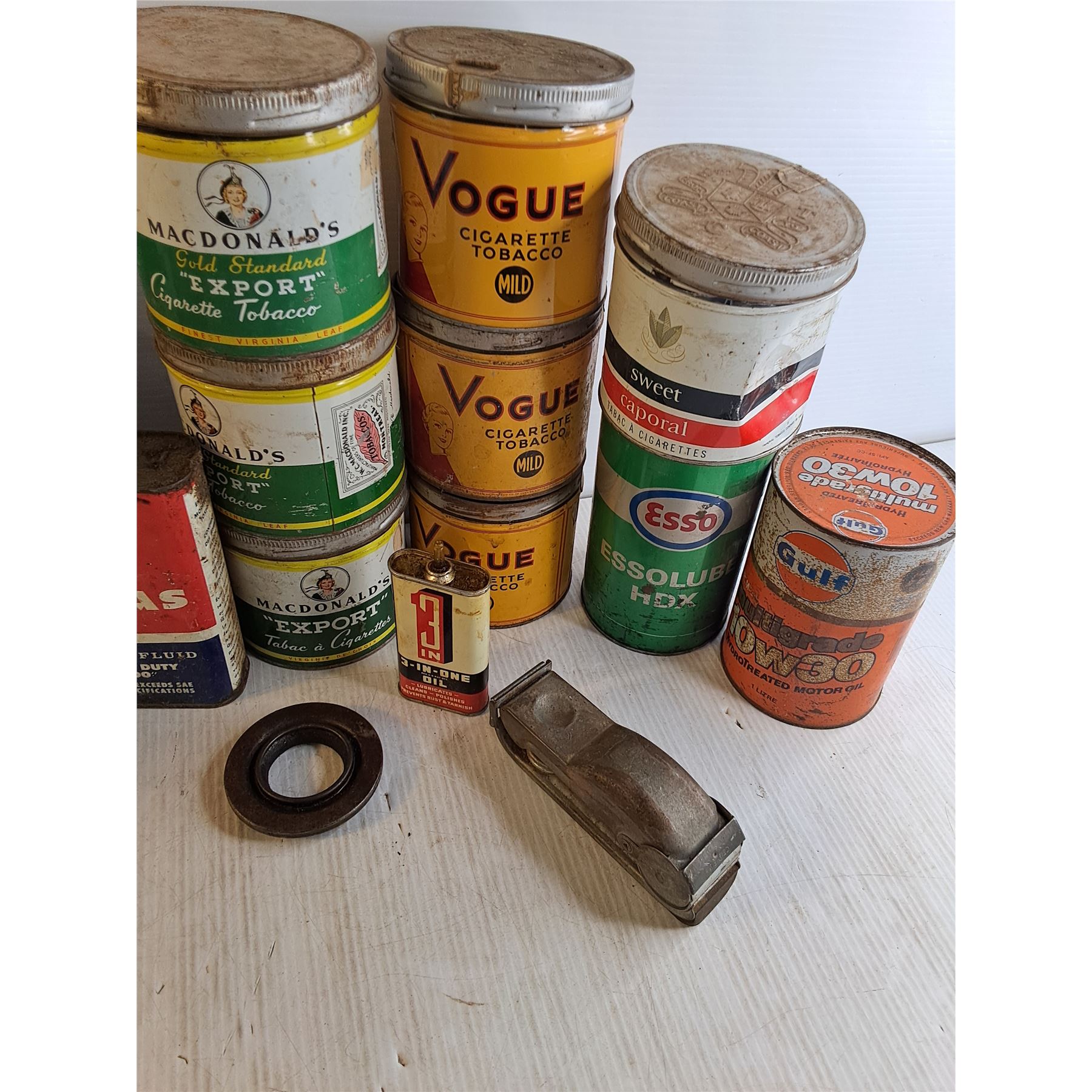 Variety Of Tobacco Tins, Brake Fluid, Gulf Motor Oil, Degreasing Concentrate, Misc-Cannot Ship