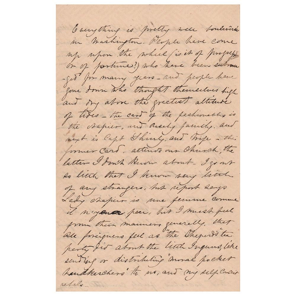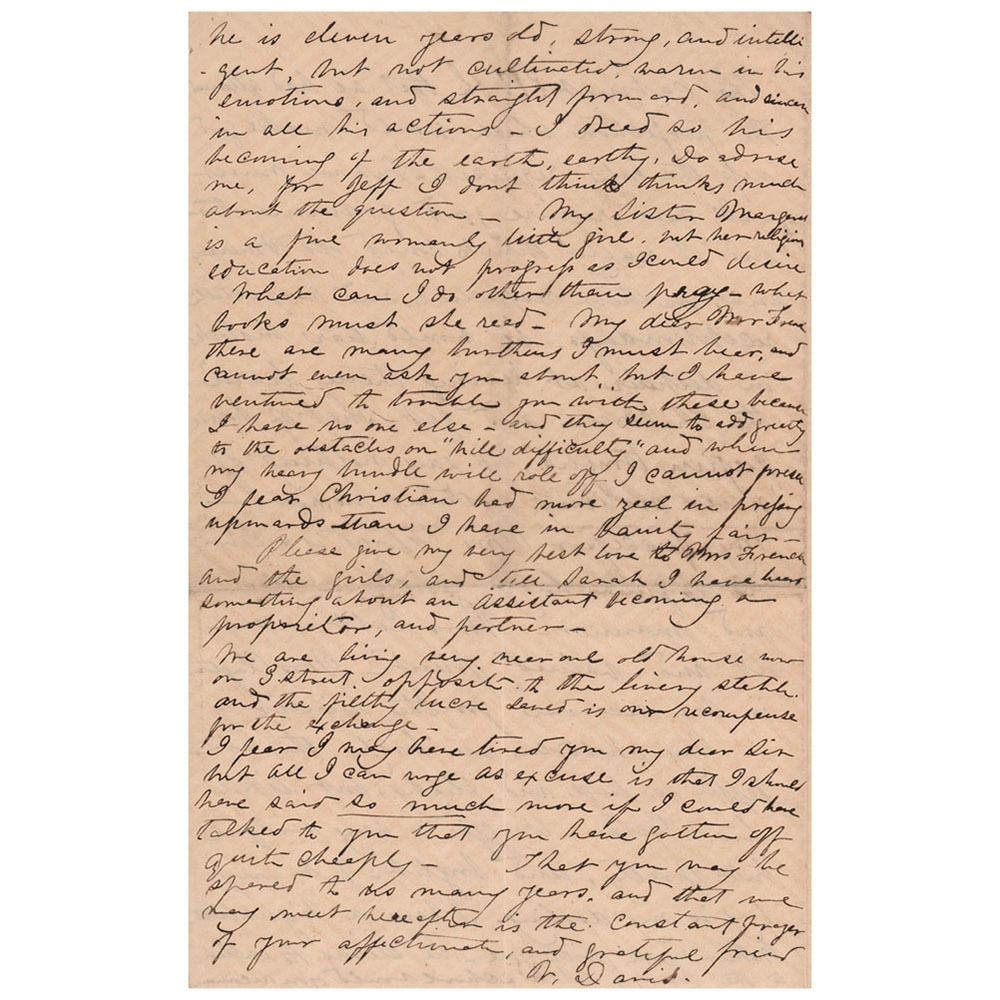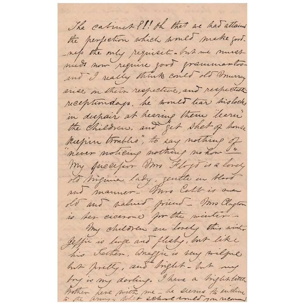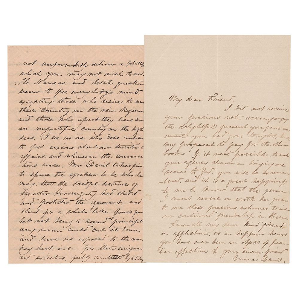 Two handwritten letters from Varina Davis—an ALS signed “Varina Davis,†and a partial ALS signed “V. Davis,†five total pages, 5.25 x 8.25 and 5 x 7.75, no date. The ALS, addressed to her “dear friend,†in part: “If it were possible to make your agency clearer in bringing me nearer to God, you will be so remembered, and it is a great happiness to me to know that the person I most revere on earth has given to me these precious volumes to insure our continued friendship in Heaven.†The partial ALS, the conclusion of an apparent 8-page letter, in part: “The Kansas and Utah question seems to fill everybody’s mind, excepting those who desire to serve their country in the new Regiment and those who assert they have served an ungrateful country on the high seas. I see no one who does not seem to feel anxious about our territorial affairs—and whenever the conversations arise, Mr. Davis takes pains to assure the speaker be he who he may, that the Dreadful Doctrine of Squatter Sovereignty had shaded and protected the ignorant…free State emigrant aid societies feebly controlled by U.S. dragons…The Cabinet?!! Of that we had attained the perfection which would make goodness the only requisite…My successor Mrs. Floyd [John Floyd succeeded Davis as Secretary of War] is a lovely old Virginia lady, gentle in blood and manner—Mrs. Cobb [Georgian Howell Cobb, Buchanan’s Secretary of the Treasury] is an old and valued friend…My children are lovely this winter. Jeffie [son Jefferson Davis Jr. was born January 16, 1857] is large and fleshy, but like his Father. Maggie [daughter Margaret born February 25, 1855] is very willful but pretty, and bright—but my boy is my darling.†In overall fine condition.
