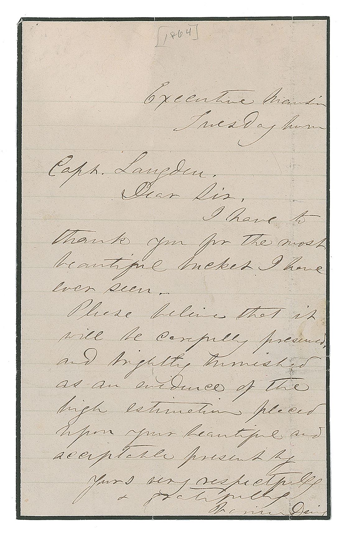 Civil War–era ALS, one page, 4 x 6.5, no date but annotated 1864 in pencil. Letter to Capt. Langdon, written from the Confederate "Executive Mansion." In part: "I have to thank you for the most beautiful bucket I have ever seen. Please believe that it will be carefully preserved, and brightly burnished, as an evidence of the high estimation placed upon your beautiful and acceptable present." In fine condition, with decreased ink flow rendering the signature light.