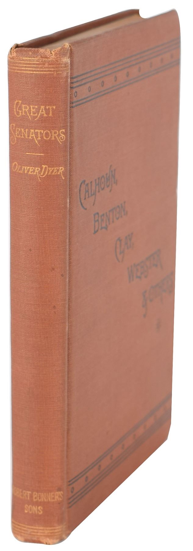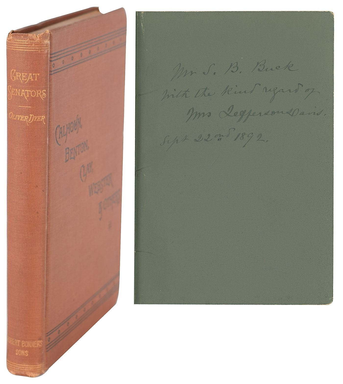 Signed book: Great Senators of the United States Forty Years Ago by Oliver Dyer. First edition. NY: Robert Bonner's Sons, 1889. Hardcover bound in brown cloth with black lettering, 5 x 7, 316 pages. Signed and inscribed on the first free end page in ink, "Mr. S. B. Buck, with the kind regard of Mrs. Jefferson Davis, Sept. 22nd 1892." Autographic condition: fine. Book condition: VG/None, with light wear at spine ends, bumped corners, and a "Library of Lawrence E. Miller" blindstamp to a rear page.