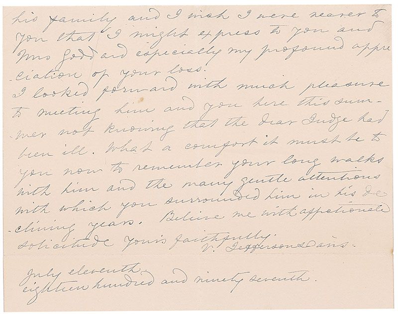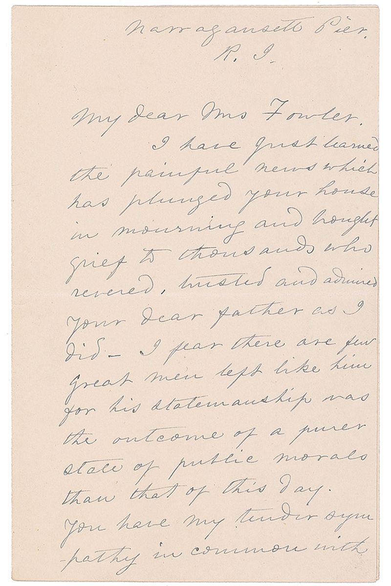 ALS signed “V. Jefferson Davis,” two pages on two adjoining sheets, 3.75 x 6, July 11, 1897. Letter to Mrs. Fowler. In part: “I have just heard the painful news which has plunged your house in mourning and brought grief to thousands who revered, trusted and admired your dear father as I did—I fear there are few great men left like him for his statesmanship was the outcome of a purer state of public morals than that of this day.” In fine condition.