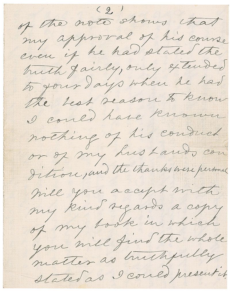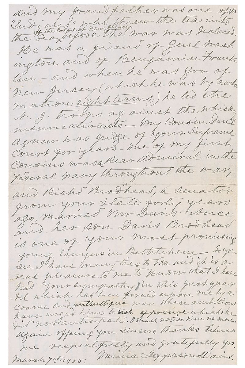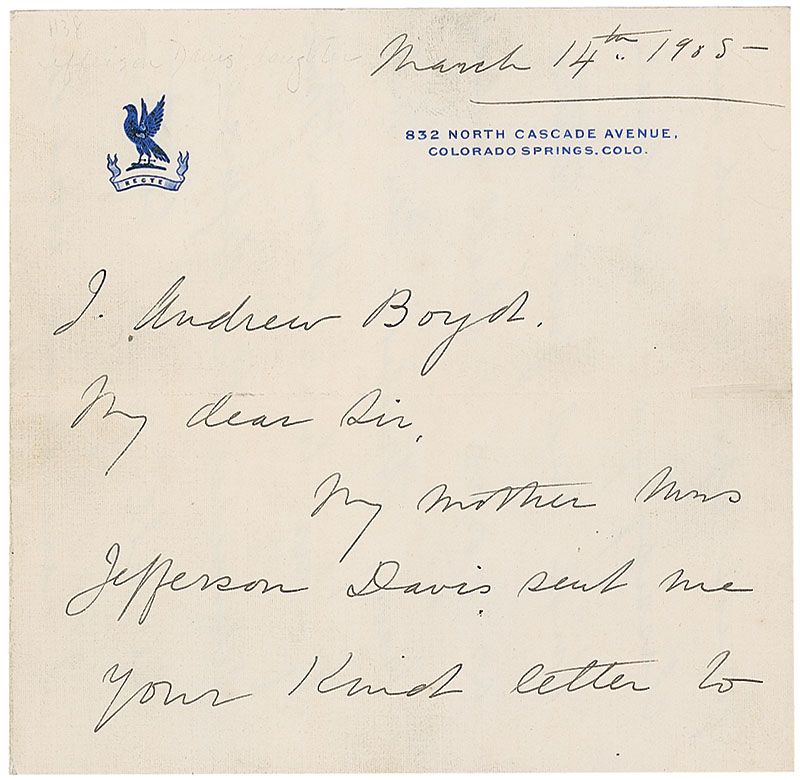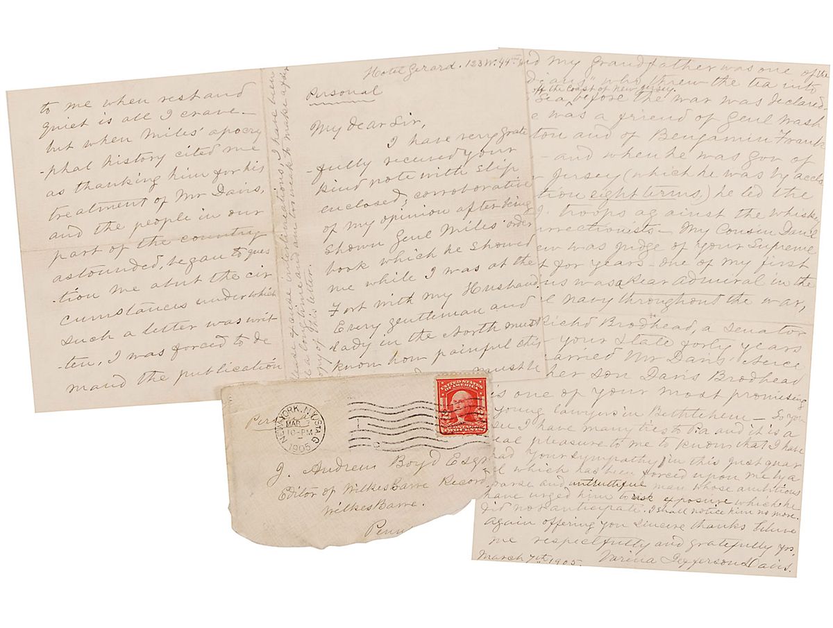 ALS signed “Varina Jefferson Davis,” eight pages on two sets of two adjoining sheets, 4 x 5, March 7, 1905. Letter written from New York’s Hotel Girard to Wilkes Barre Record editor J. Andrew Boyd. In part: “I have very gratefully received your kind note with slip enclosed, corroborative of my opinion after being shown Genl Miles order book which he showed me while I was at the Fort with my Husband…Mr Davis was taken to prison on the 19th [May 1865], I sailed under sealed orders on the 23d not knowing to what port we were bound, or what was to be our fate, with my four babies—I may have asked Miles to give me what news he could, and he certainly gave me false answers, but I believed him and was willing perhaps to send him thanks, however the date of the note shows that my approval of his course even if he had stated the truth fairly, only extended to four days when he had the best reason to know I could have known nothing of his conduct or of my husband’s condition, and the thanks were personal.” Accompanied by the address panel from the original mailing envelope addressed in Davis’s hand. Also accompanied by a March 14, 1905, letter from Margaret H. Jefferson Davis Hayes to Boyd. In fine condition, with some scattered mild toning and a central horizontal fold to both sets of pages.