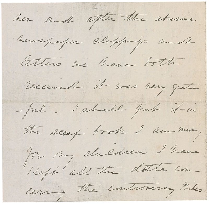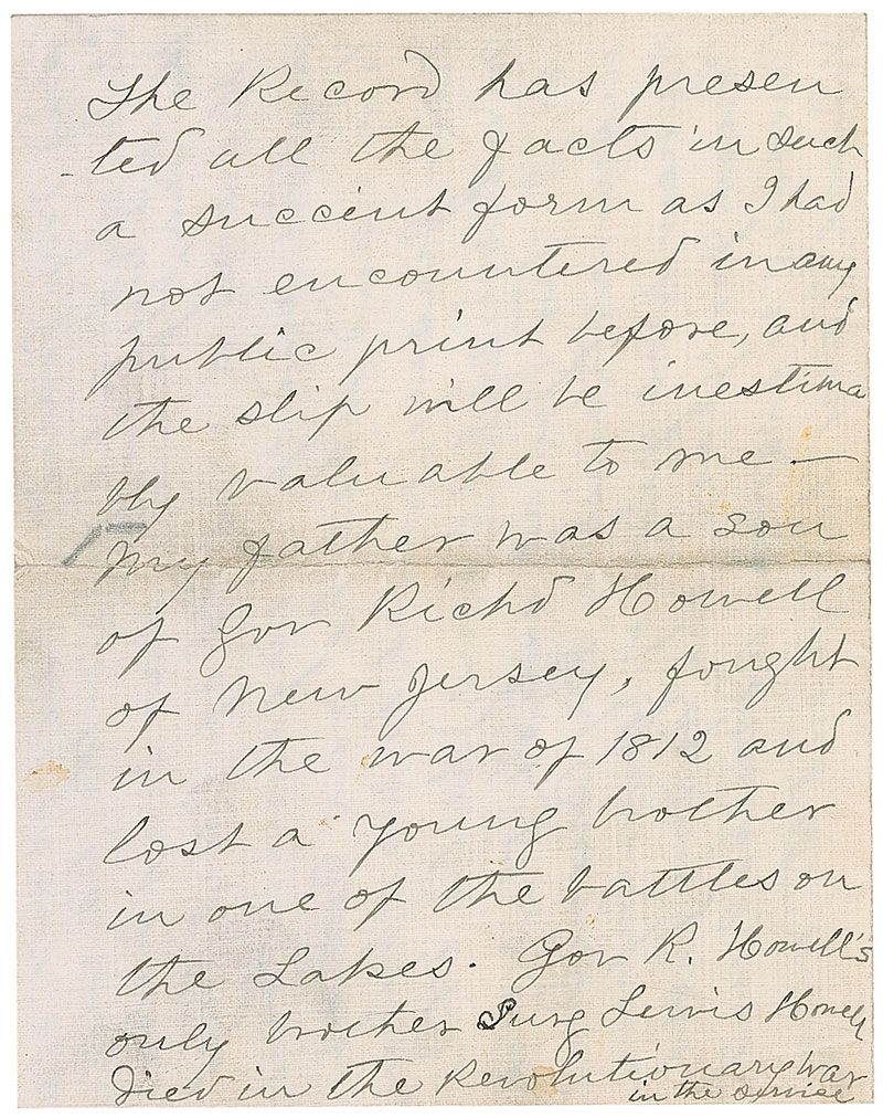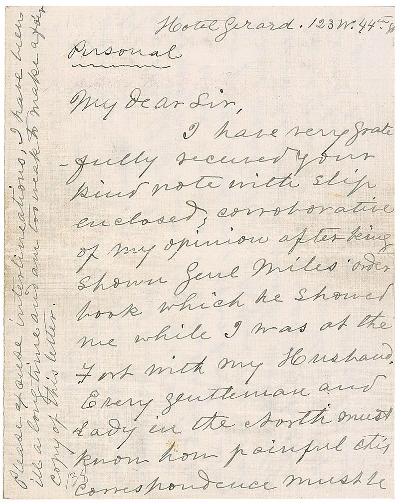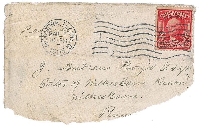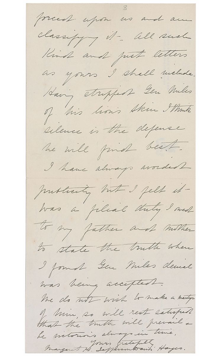 ALS signed “Varina Jefferson Davis,” eight pages on two sets of two adjoining sheets, 4 x 5, March 7, 1905. Letter written from New York’s Hotel Girard to Wilkes Barre Record editor J. Andrew Boyd. In part: “I have very gratefully received your kind note with slip enclosed, corroborative of my opinion after being shown Genl Miles order book which he showed me while I was at the Fort with my Husband…Mr Davis was taken to prison on the 19th [May 1865], I sailed under sealed orders on the 23d not knowing to what port we were bound, or what was to be our fate, with my four babies—I may have asked Miles to give me what news he could, and he certainly gave me false answers, but I believed him and was willing perhaps to send him thanks, however the date of the note shows that my approval of his course even if he had stated the truth fairly, only extended to four days when he had the best reason to know I could have known nothing of his conduct or of my husband’s condition, and the thanks were personal.” Accompanied by the address panel from the original mailing envelope addressed in Davis’s hand. Also accompanied by a March 14, 1905, letter from Margaret H. Jefferson Davis Hayes to Boyd. In fine condition, with some scattered mild toning and a central horizontal fold to both sets of pages.
