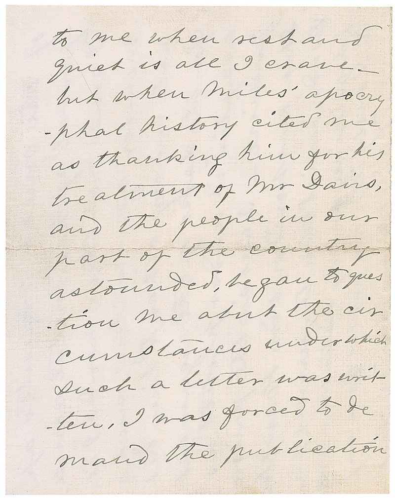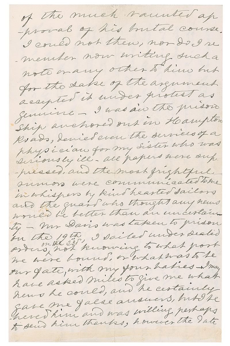 While in command at Fort Monroe, Nelson Miles became the target of public outrage, accused of inflicting cruel and excessive punishment on his prisoner, defeated Confederate President Jefferson Davis. Hoping to clear his name and run for national office, he reopened the issue in 1898 by publicly claiming that Varina Davis had thanked him for treating her husband well at the Fort. In 1905, after years of bitter public exchanges, she challenged the ‘coarse and untruthful man whose ambitions have urged him to risk exposure which he did not anticipate’ to document his statement; he replied by publishing the first two sentences of a note from her dated May 23, 1865. Here she addresses the letter, stating, “he certainly gave me false answers, but I believed him and was willing perhaps to send him thanks, however the date of the note shows that…I could have known nothing of his conduct or of my husband’s condition.” This lengthy letter, written by the weary hand of the elderly widow, holds the conviction and passion that helped the Confederate First Lady maintain her dignity and rebuild a life after the war: an extraordinary piece addressing her husband’s imprisonment and his harsh captor.