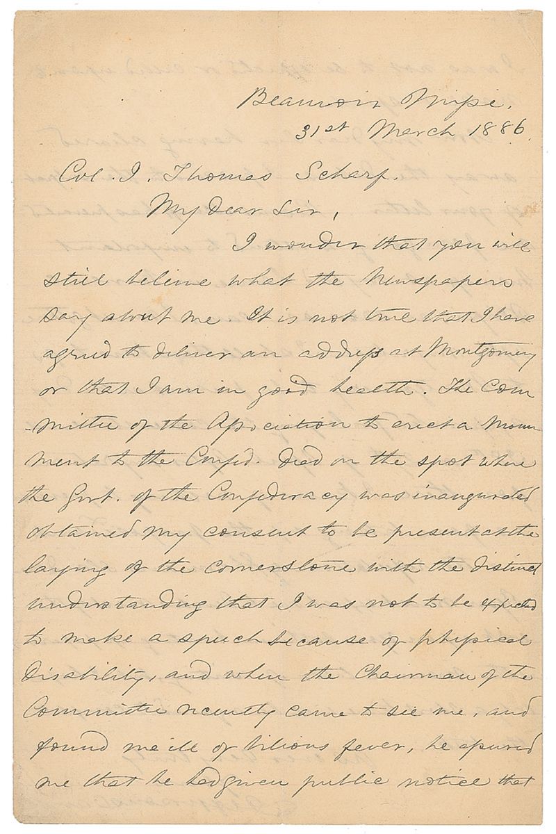 ALS dictated to Varina by her husband and signed “Jefferson Davis,” in her hand, one page both sides, 5.5 x 8.75, March 31, 1886. Letter to Colonel James Scharf. In full: “I wonder that you will still believe what the Newspapers say about me. It is not true that I have agreed to deliver an address at Montgomery or that I am in good health. The committee of the Association to erect a Monument to the Confed. dead on the spot where the Govt. of the Confederacy was inaugurated obtained my consent to be present at the laying of the cornerstone with the distinct understanding that I was not to be expected to make a speech because of physical disability and when the Chairman of the Committee recently came to see me, and found me ill of bilious fever, he assured me that he had given public notice that I was not to be expected or called upon to make a speech. Now my dear Sir having cleared away the debris, I proceed to the subject of your letter. Recent illness has prevented me from going to attend to important business at my old house in Warren Co. Missi. As soon as I can, I must go there. After my return I shall then have to go to Montgomery to be present on the day appointed for laying the cornerstone—the 28th or 29th of April. After my return from there I know of nothing to prevent us from taking up the proposed work i.e. the refutation of Sherman’s slanders. You must expect me to devolve most of the work upon you both in hunting up papers & the manual labor of writing, but I hope only a short time will be required to complete the task.” In fine condition, with a central vertical fold and a few corner creases. It took much persuasion from the mayor of Montgomery to finally get Davis to commit to being a guest of honor and laying a cornerstone for the monument to Alabama’s Civil War dead. The former Confederate president finally acquiesced, under the strict assurance he would not be required to speak, mostly due to the fact of his advanced age. His single-city stop would grow into an extended tour, with stops in Savannah and Atlanta for other dedications and political purposes.