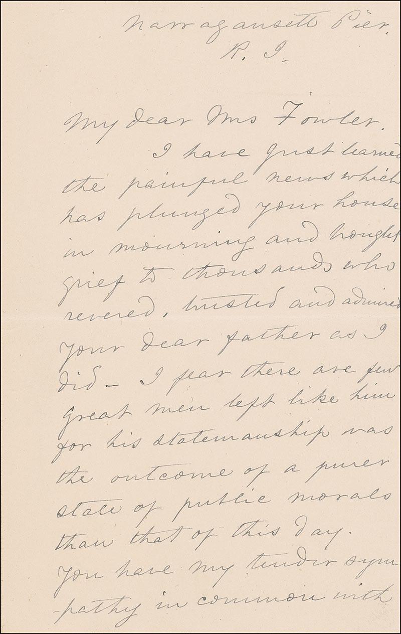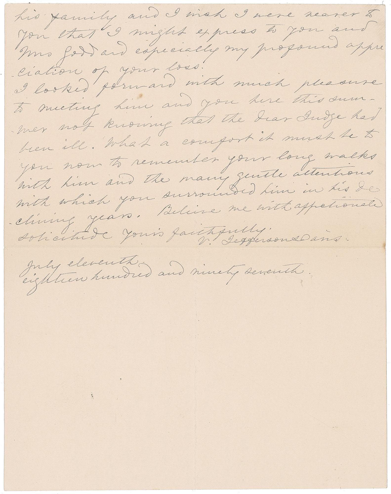 Wife of Jefferson Davis and First Lady of the Confederacy. ALS signed “V. Jefferson Davis,” two pages on two adjoining sheets, 4 x 6.25, July 11, 1897. Letter to Mrs. Fowler following the loss of her father. In part: “I have just learned the painful news which has plunged your house in mourning and brought grief to thousands who revered, trusted, and admired your dear father as I did. I fear there are few great men left like him for his statesmanship was the outcome of a purer state of public morals than that of this day…I looked forward with much pleasure to meeting him and you here this summer not knowing that the dear Judge had been ill.” In fine condition, with bisecting horizontal fold, and a mild shade of toning. Pre-certified PSA/DNA and RRAuction COA.