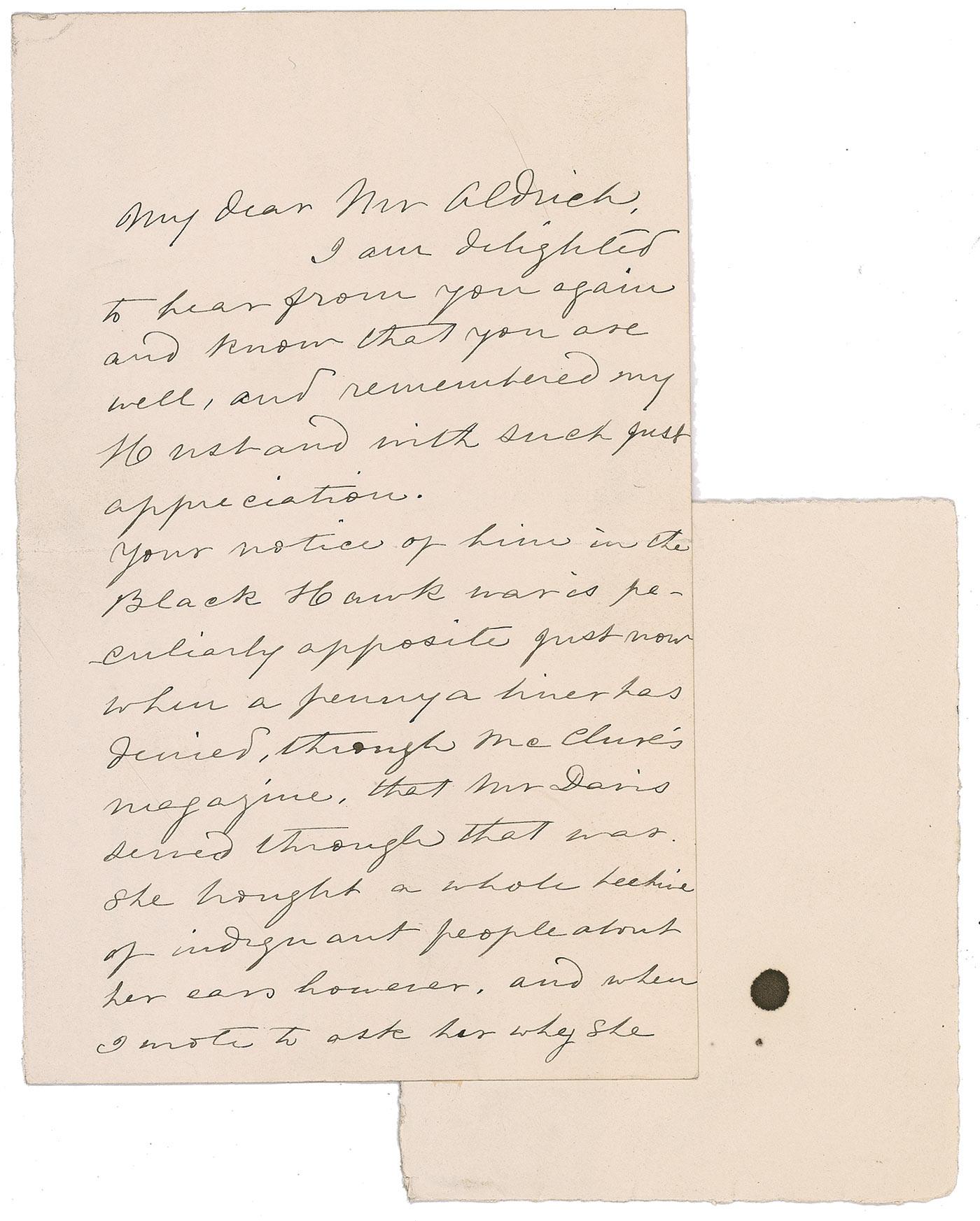 Wife of Jefferson Davis and First Lady of the Confederacy. ALS signed “Varina Jefferson Davis,” three pages on two adjoining sheets, 4 x 6, May 6, 1896. Letter to Charles Aldrich at the Historical Department of Iowa. In part: “I am delighted to hear from you again and know that you are well, and remembered my husband with such great appreciation. Your notice of him in the Black Hawk war is peculiarly appropriate just now when a *** has denied, through McClure’s magazine, that Mr. Davis served through that war. She brought a whole beehive of indignant people about the ears however, and when I wrote to ask her why she denied to people a statement she said he was not mentioned in the records, but she would try to find the truth about ‘this scrimmage.’ I did not answer her flippant note.” The original mailing envelope panel has been affixed to the bottom of the last page. Intersecting folds, one through a single letter of signature, and a tear to top edge, otherwise fine condition. Pre-certified PSA/DNA and RRAuction COA.