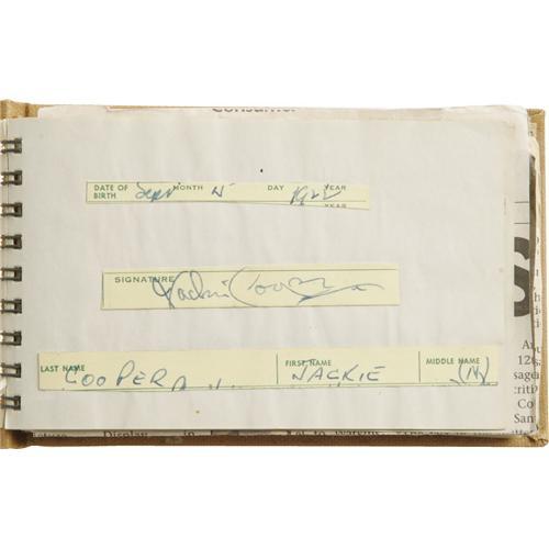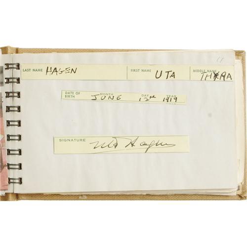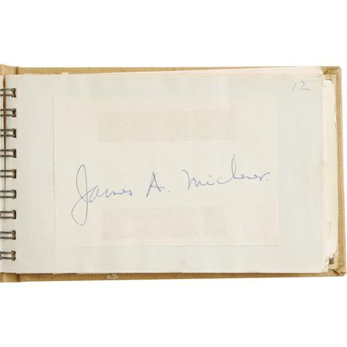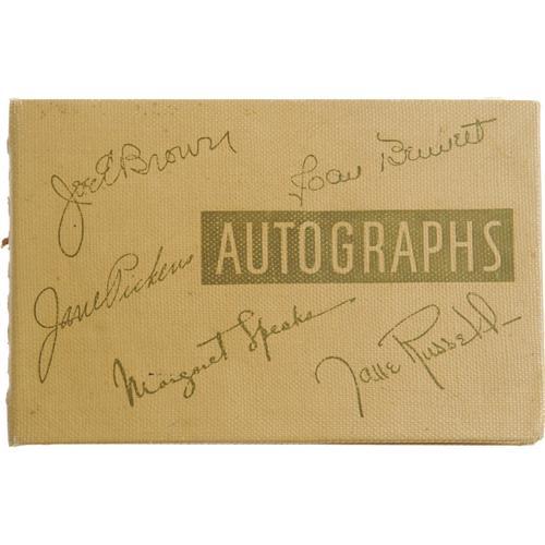 <B>Various Artists - Vintage Autograph Book.</B></I> Small brown autograph album with signatures from Jackie Cooper, Uta Hagen, James A. Michener, Buddy Hackett, Dino Fazio, Merv Griffin, Eileen Brennan, Alan Alda, and many others. In Very Fine condition with some mild wear and one loose page. <I>Accompanied by LOA from PSA/DNA.</B></I><BR><BR><b>Shipping:</b> Books & Catalogs (<a target="_blank" href="http://www.heritageauctions.com/common/shipping.php">view shipping information</a>)