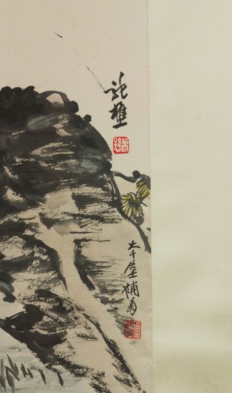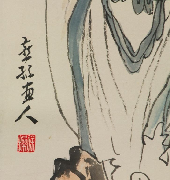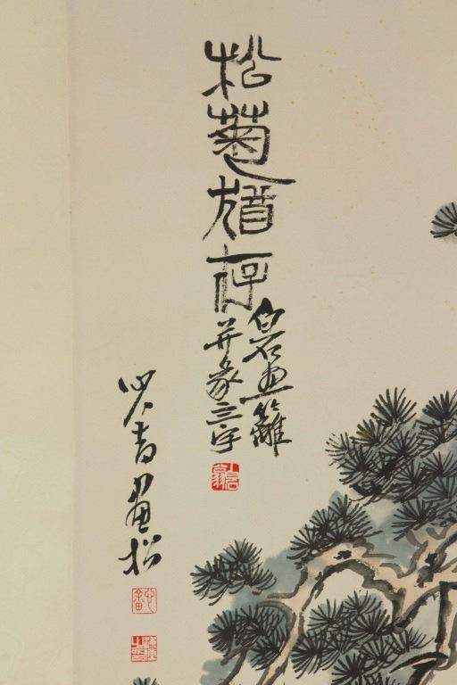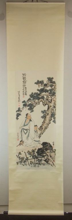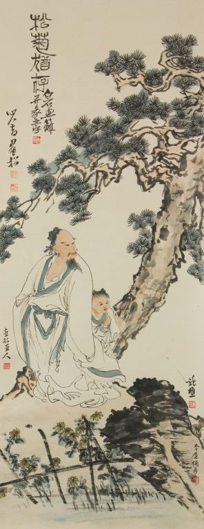 Hermits and page boy with pine tree and chrysanthemum; Chinese ink and watercolour on paper; hanging scroll; painted by various artists: pine tree by Puru (1896-1963), with 2 seals; figure by Xu Cao (1899-1961), with 1 seal; fence and title by Qi Baishi (1864-1957); with 1 seal; chrysanthemum by Zhang Daqian (1899-1983), with 1 seal; rock by Xiao Xun (1883-1944), with 1 seal; 104 cm x 42cm