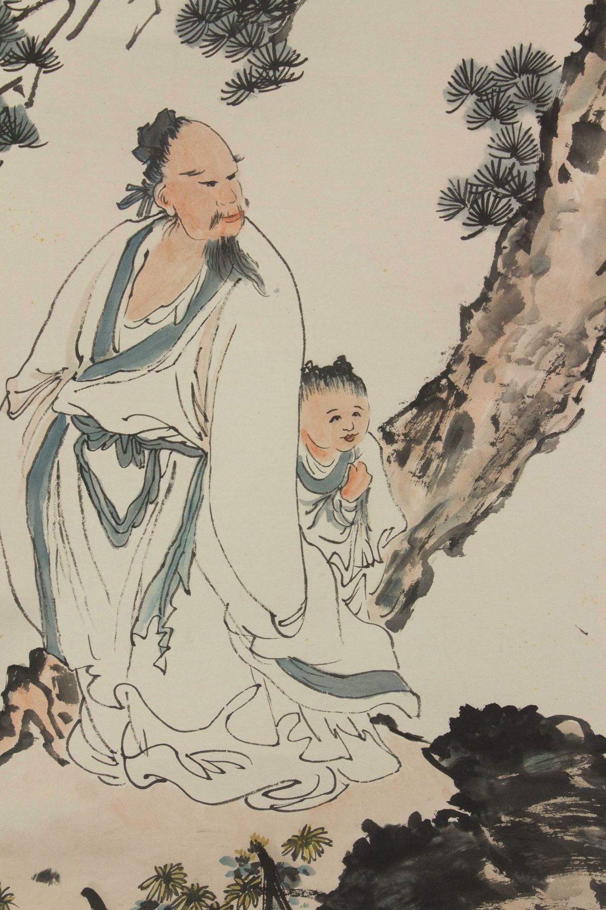 Hermits and page boy with pine tree and chrysanthemum; Chinese ink and watercolour on paper; hanging scroll; painted by various artists: pine tree by Puru (1896-1963), with 2 seals; figure by Xu Cao (1899-1961), with 1 seal; fence and title by Qi Baishi (1864-1957); with 1 seal; chrysanthemum by Zhang Daqian (1899-1983), with 1 seal; rock by Xiao Xun (1883-1944), with 1 seal; 104 cm x 42cm