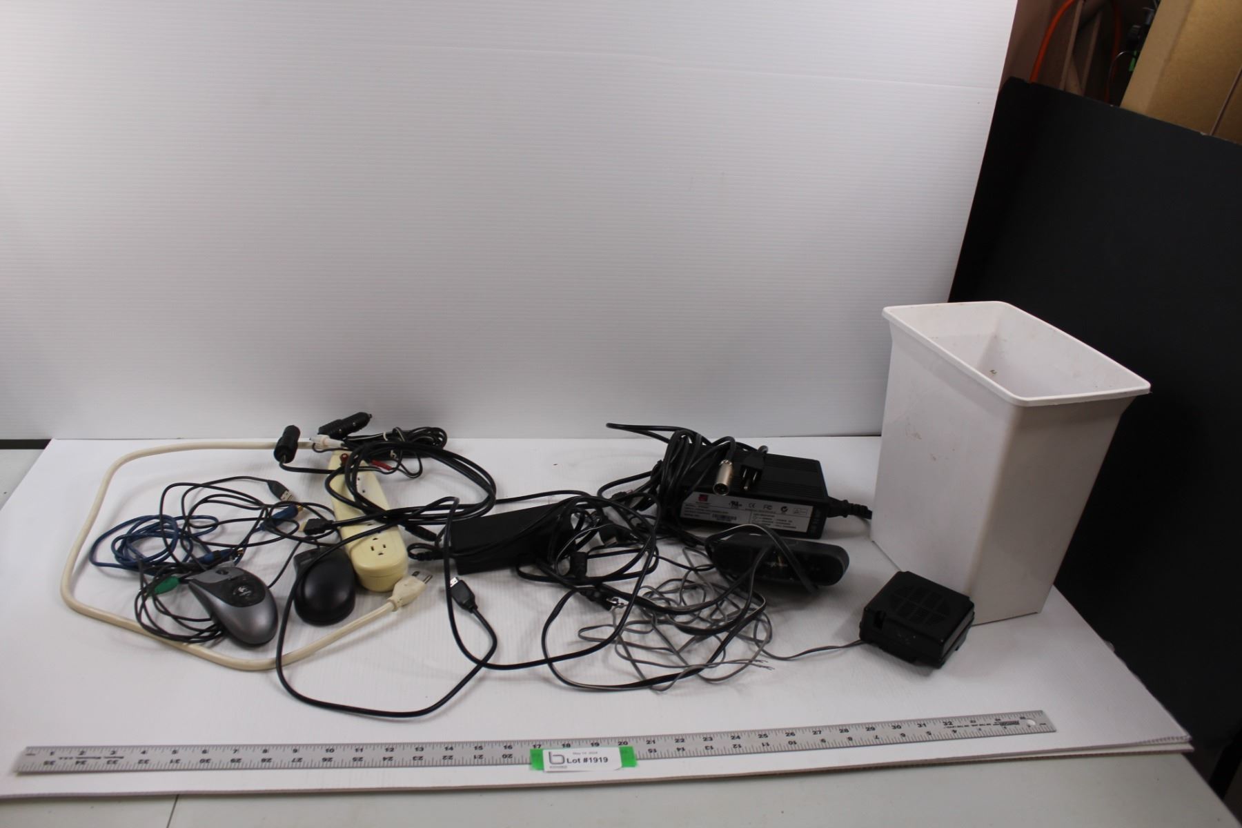 Various Electronics Cables,(2) Wired Mouse, Power Bar, A/C Adapters, Small Waste Bin etc.