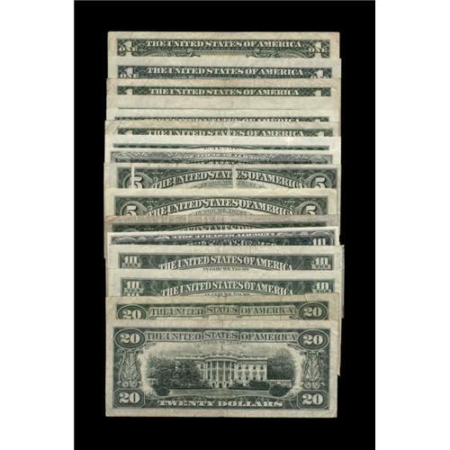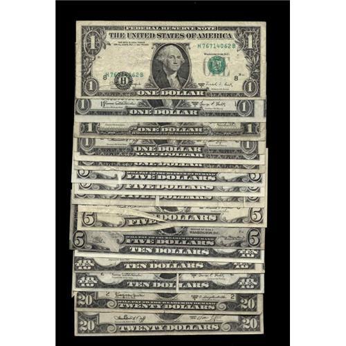 <B>Various Errors</B></I> including $1 1935E Silver obstruction error over part of the left serial number <B>Fine;</B></I> $1 1969D FRN front misalignment portion of adjacent note at right <B>VF;</B></I> $1 1974 FRN front misalignment portion of adjacent note at top <B>XF;</B></I> $1 1981 FRN gutter fold <B>F-VF;</B></I> $1 1988A FRN black portion of over print dropped <B>Fine;</B></I> $1 1999 FRN Star note black district seal missing <B>VF+;</B></I> $5 1934A FRN multiple gutter folds at lower left corner "accordion cut" <B>VF+;</B></I> $5 1950B FRN gutter fold <AU;</B></I> $5 1974 FRN light front to back offset <B>CH AU;</B></I> $5 1977A FRN multiple gutter folds <B>VF;</B></I> $5 1981 FRN gutter mis-cut lower left corner <B>XF;</B></I> $10 1969B FRN moderate front to back offset <B>CH AU;</B></I> $10 1963C FRN multiple gutter folds <B>VF;</B></I> $10 1981 FRN front misalignment <B>XF;</B></I> $20 1950D FRN gutter fold <B>Fine;</B></I> $20 1974 FRN moderate misaligned third printing <B>F+.</B></I><BR>