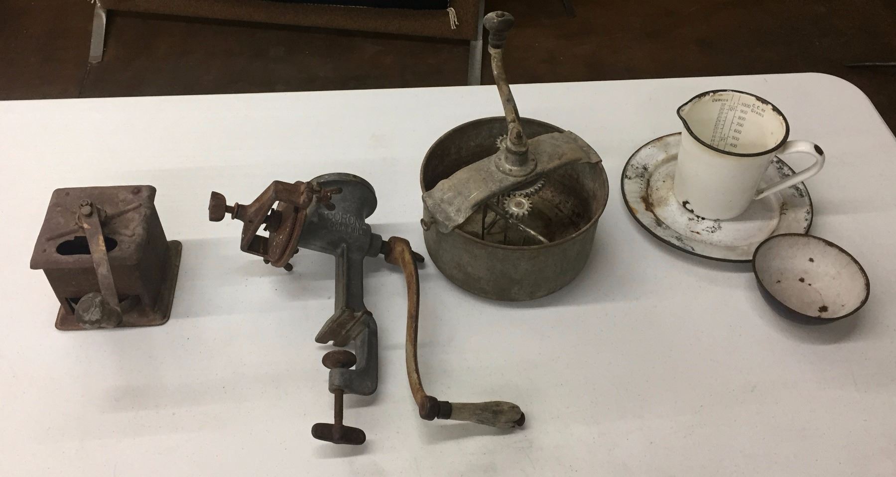 Maker: Various. Approx. Age: Circa late 1800s through early 1900s. Size: Varies. Condition: Poor to fair. As Found. Additional Info: Group of numerous cooking and kitchen related items found by treasure hunter, Orville Mickens of the Frontier Relics Museum. Please look closely at the pictures - they are an important part of our description. Shipping: There will be a $10 handling / packaging fee for shipping this lot. The actual cost of postage will be added on top of that.