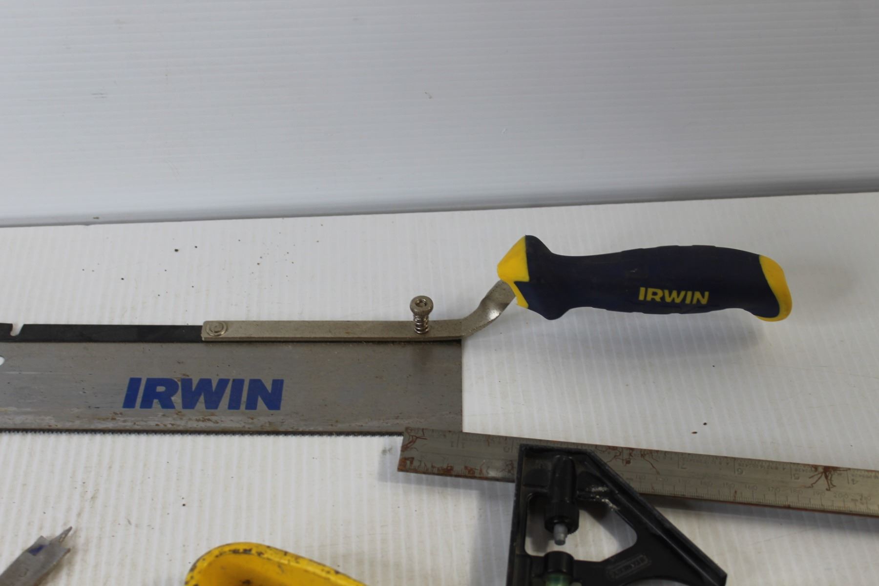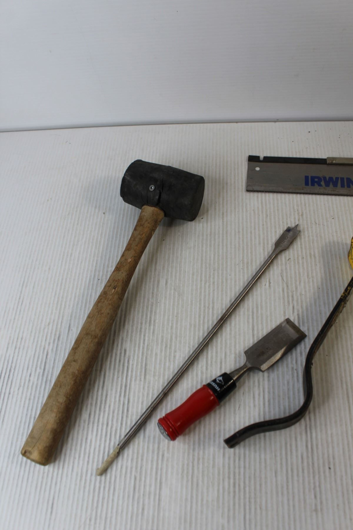 Various Hand Tools - Chisels, Irwin Saw, Rubber Mallet, Pry Bar, Long 3/4" Spade Bit, Stanley T Square etc.