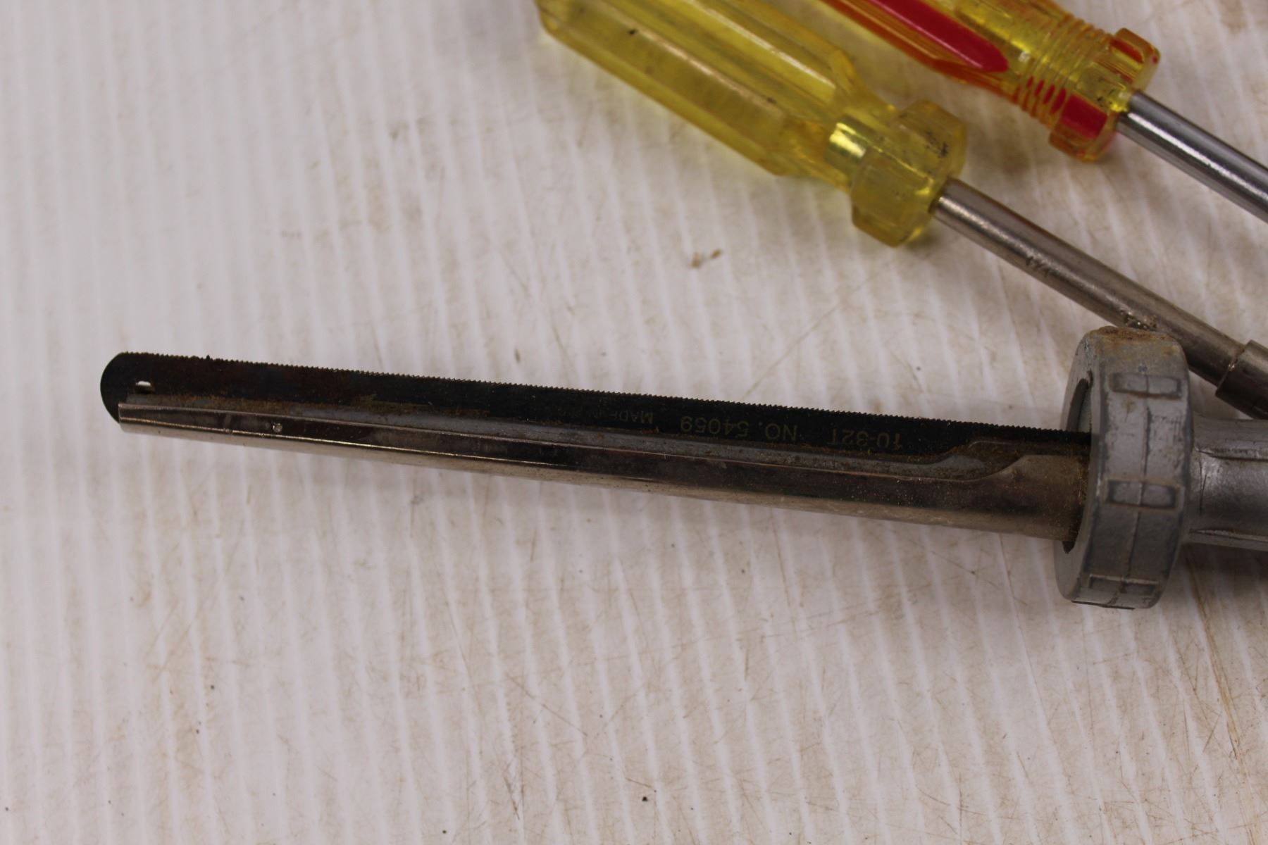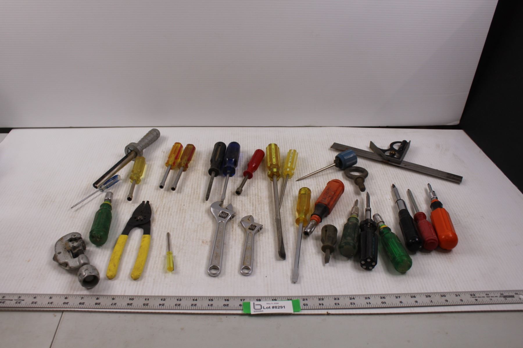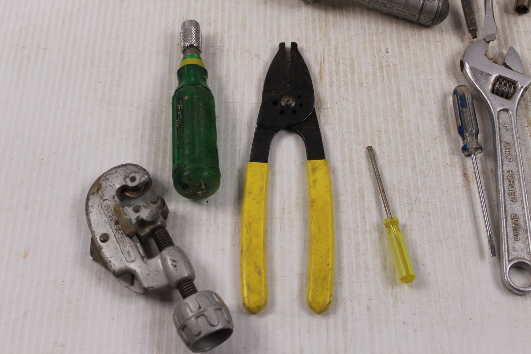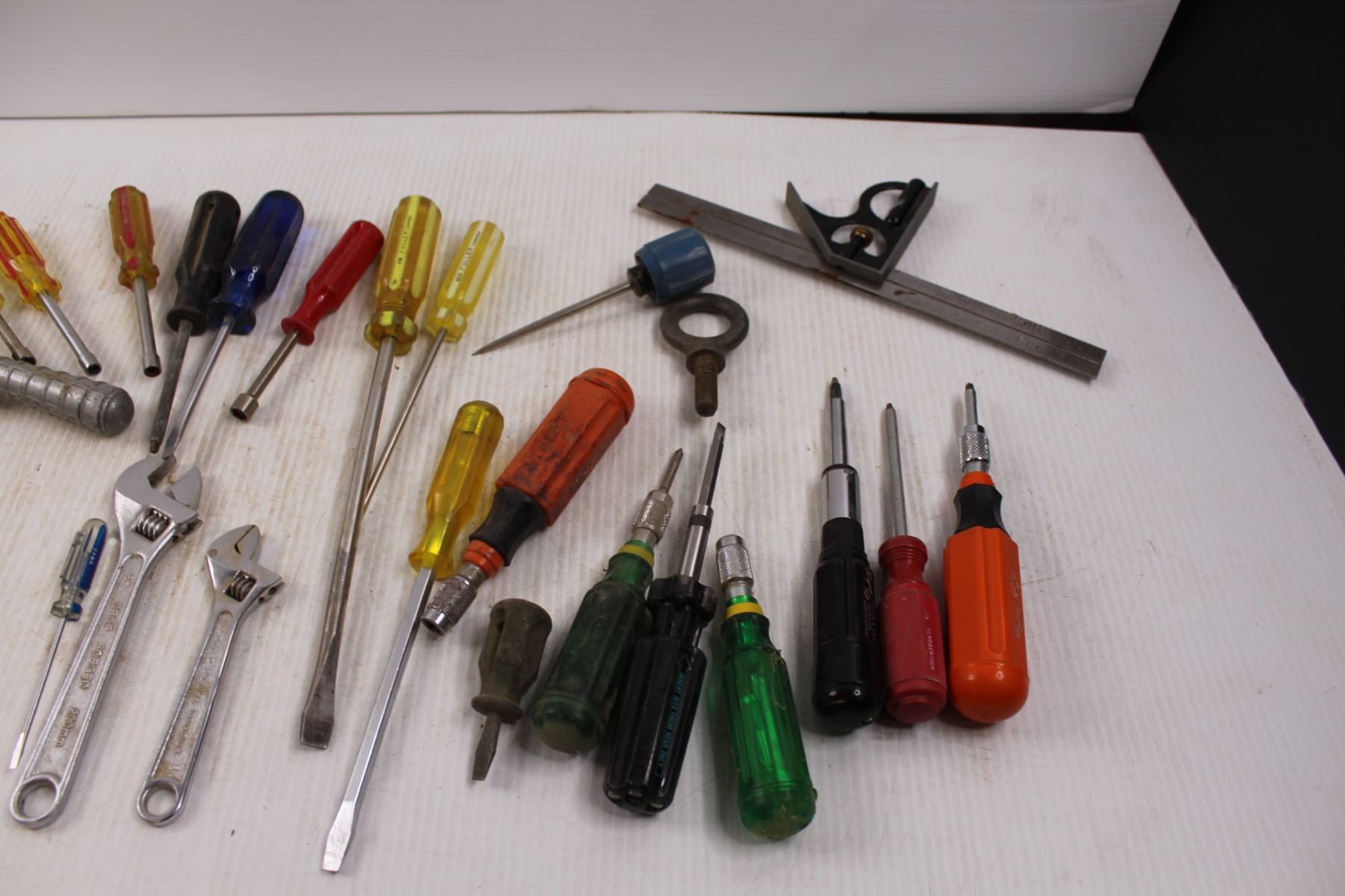 Various Hand Tools - Screwdrivers, Nut Drivers, Adjustable Wrenches, Multi-bit Screwdrivers, Blue Point Hacksaw Blade Saw/Handle, RIDGID No.10 Tubing Cutter, T-Square, Awl, Wire Strippers, Threaded Eyelet etc.