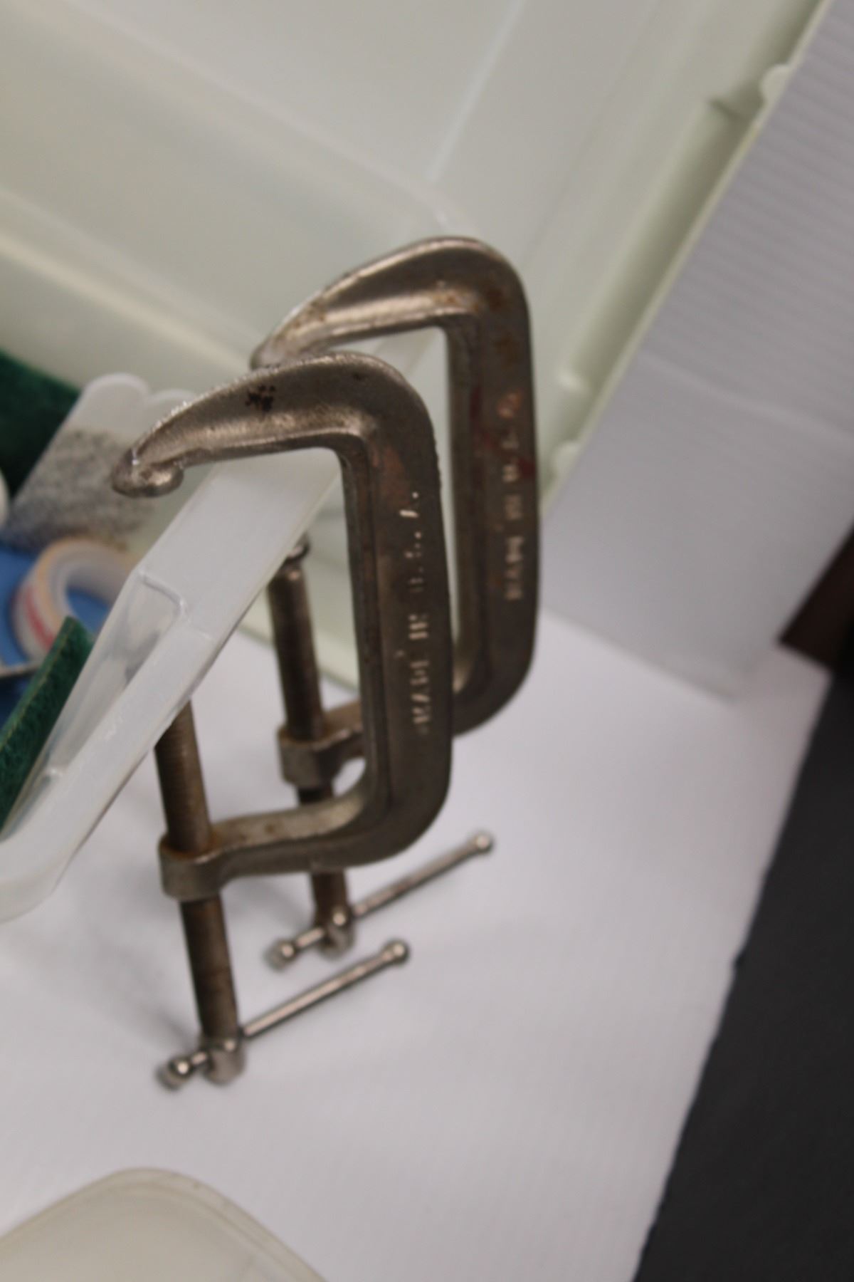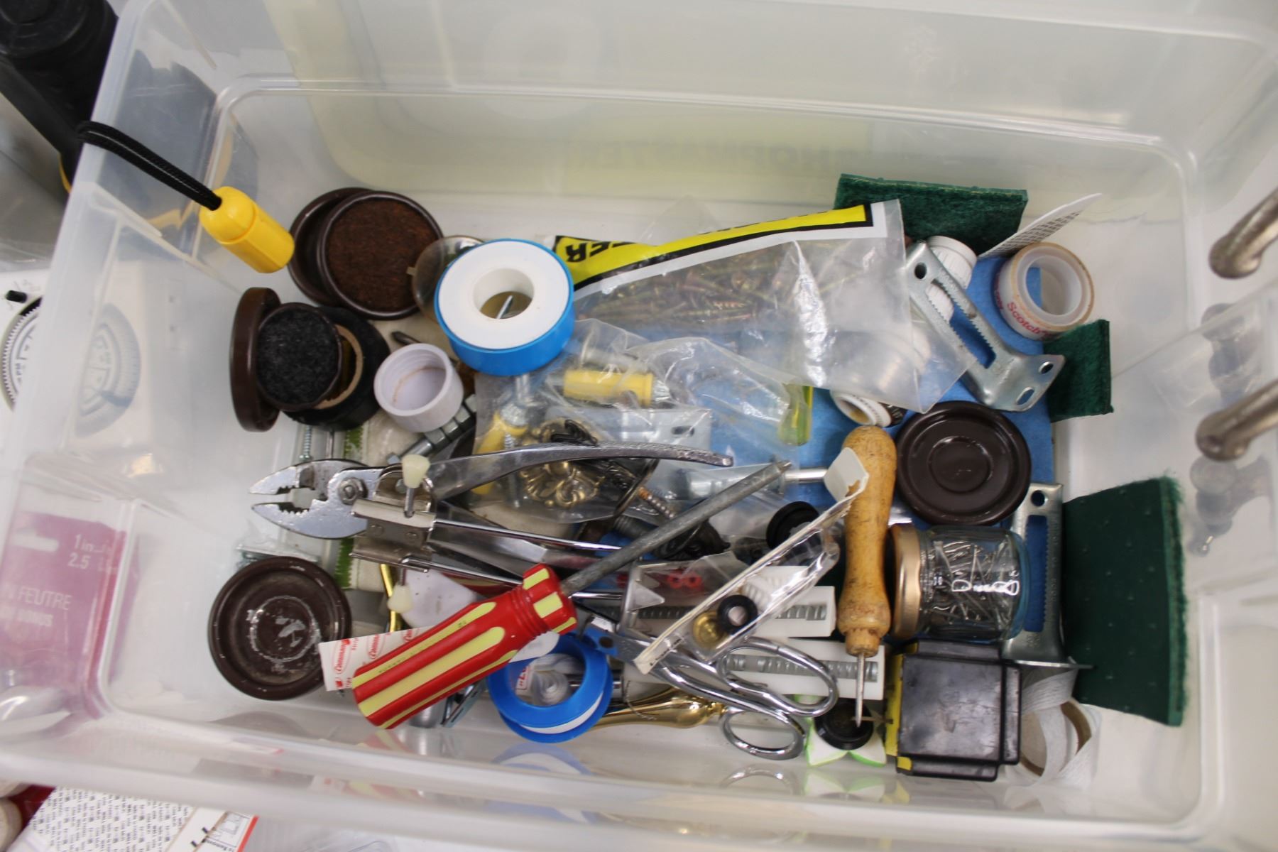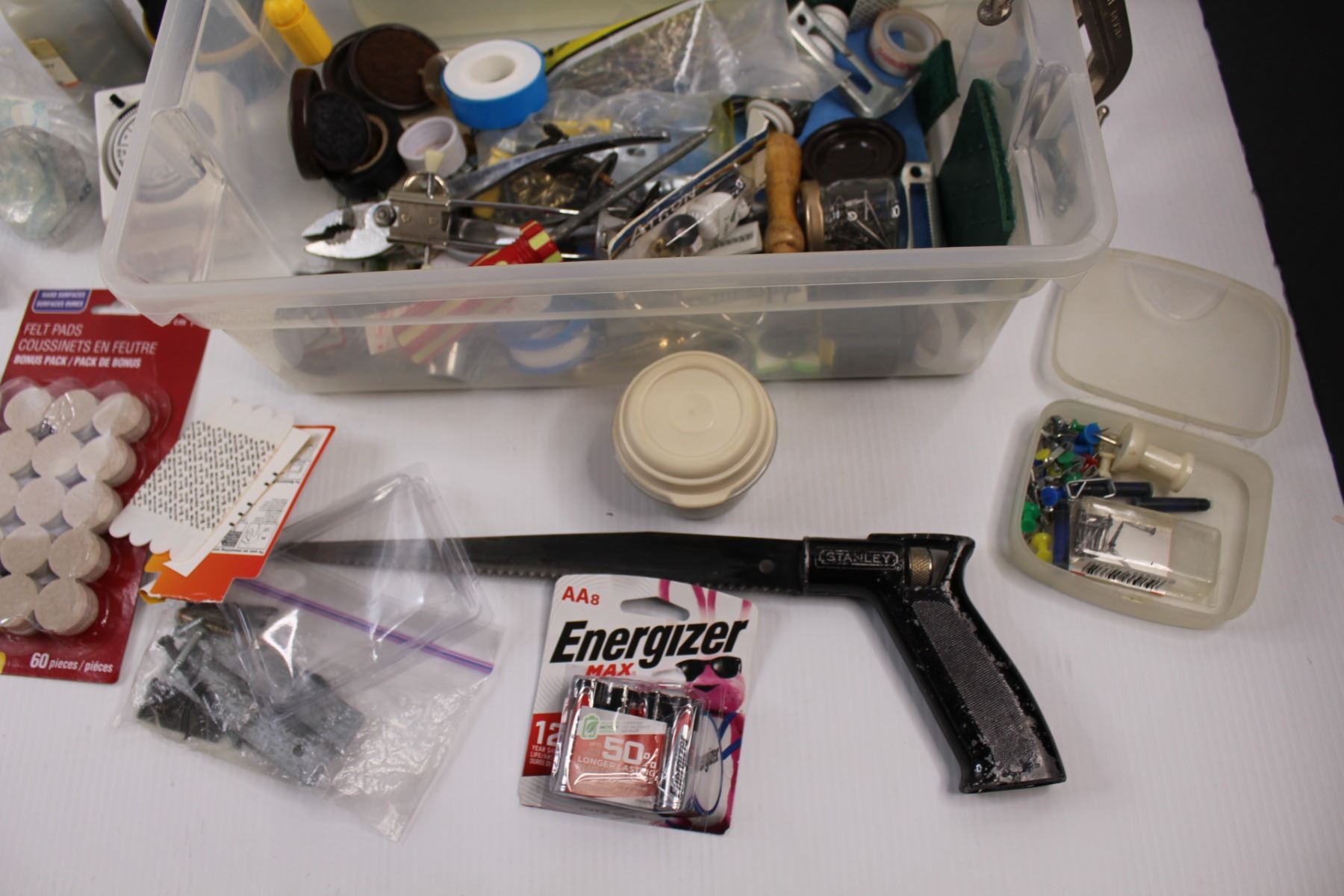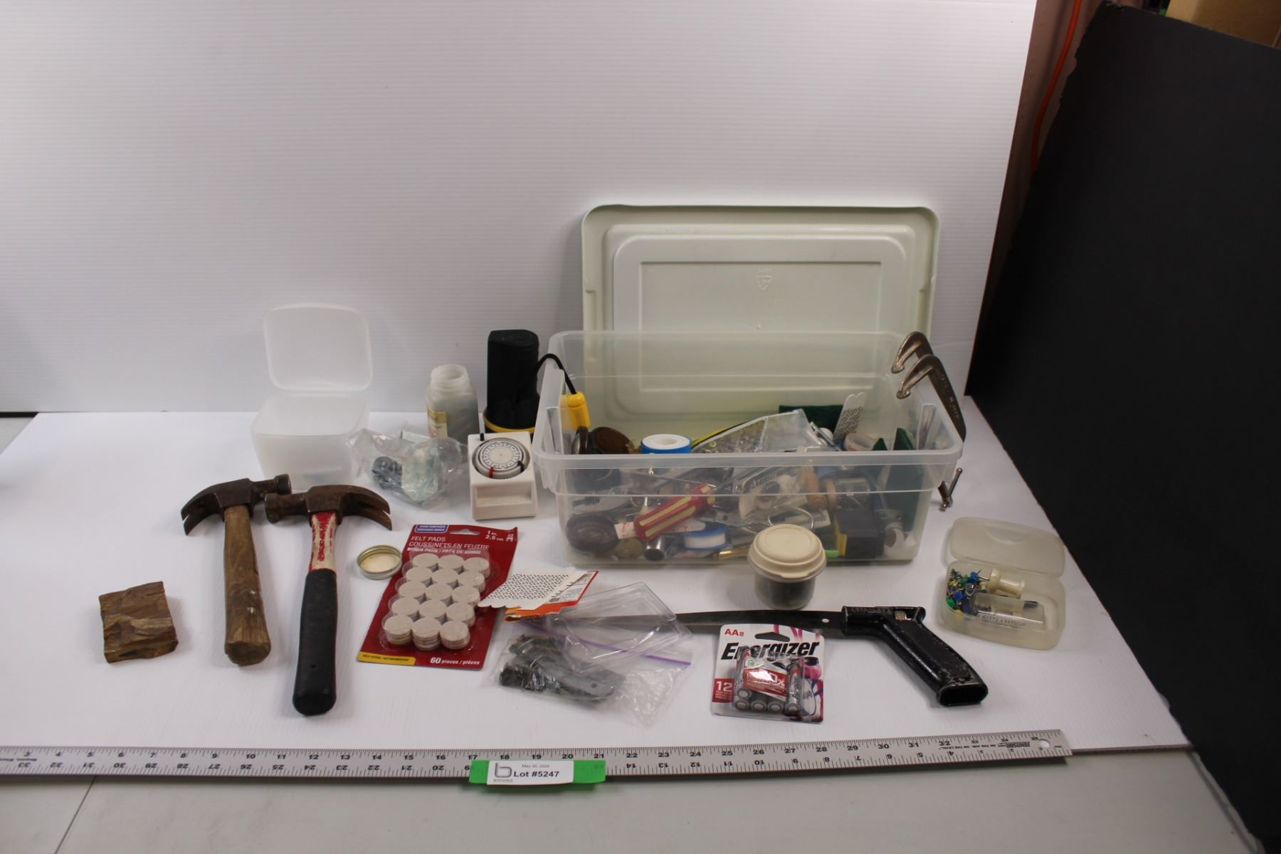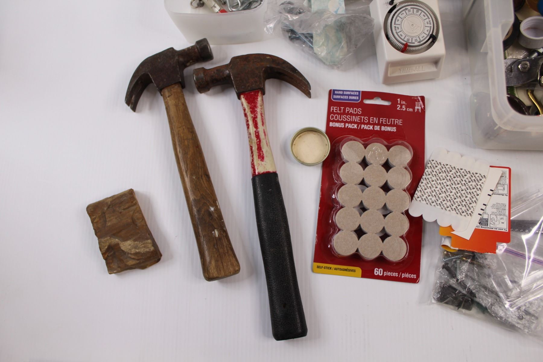 Various Household Tools & Hardware - Flash Light, Hammers, Felt Pads, Screws, Timer, C-Clamps, Saw, Batteries etc. w/Tote & Petrified Wood