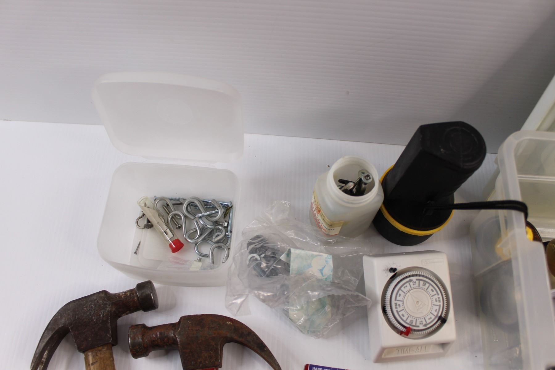 Various Household Tools & Hardware - Flash Light, Hammers, Felt Pads, Screws, Timer, C-Clamps, Saw,