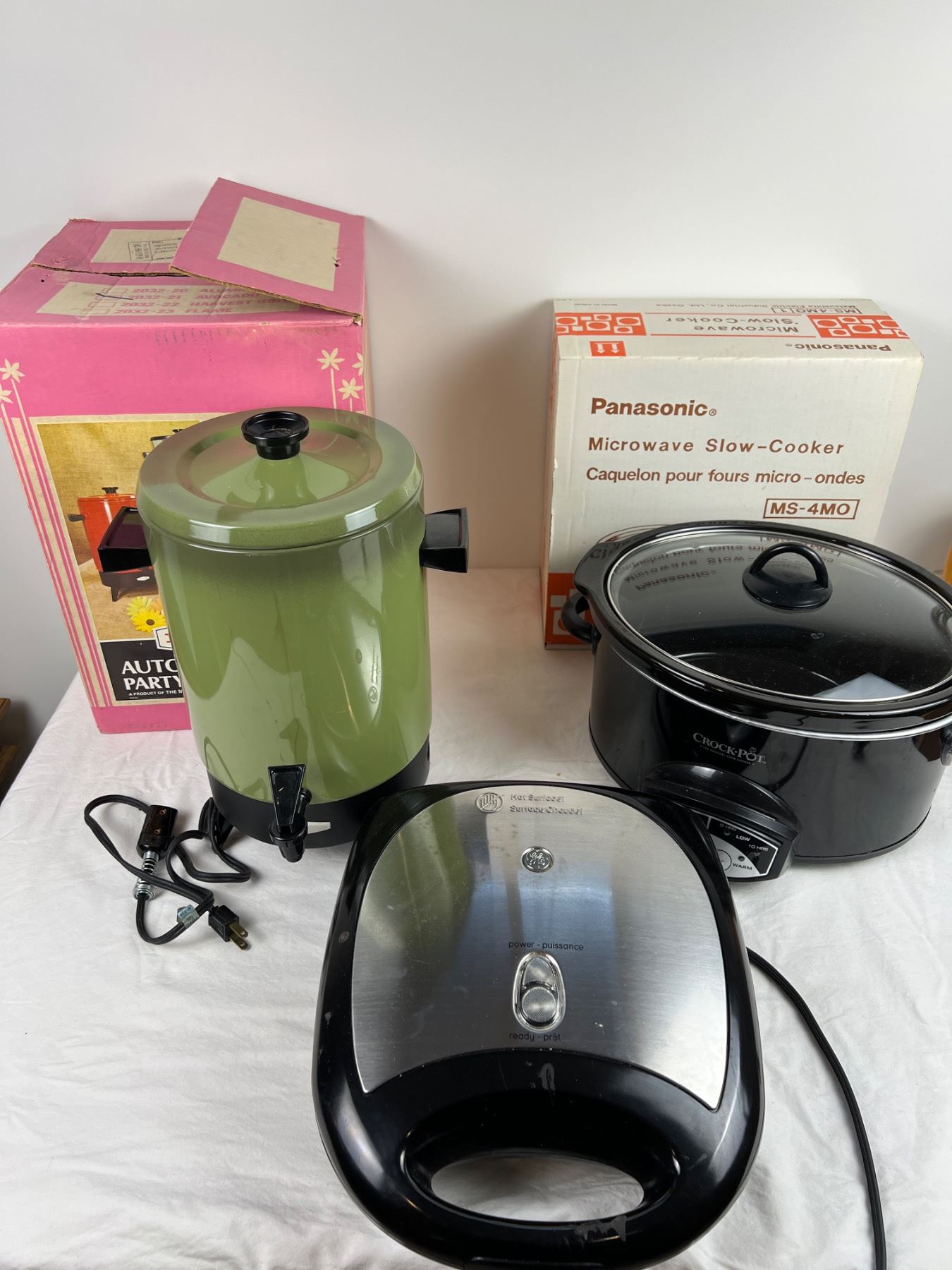 Includes, Panasonic Microwave Slow Cooker (new in open box), Crockpot, and more, all turn on