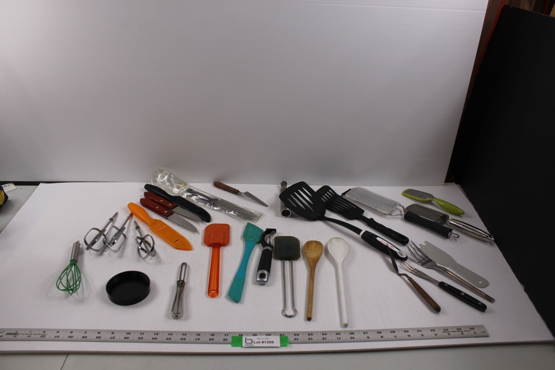 Various Kitchen Utensils - Spatulas, Peelers, Knives, Whisk, Spoons, Pepper Grinder, Grader/Zesters,