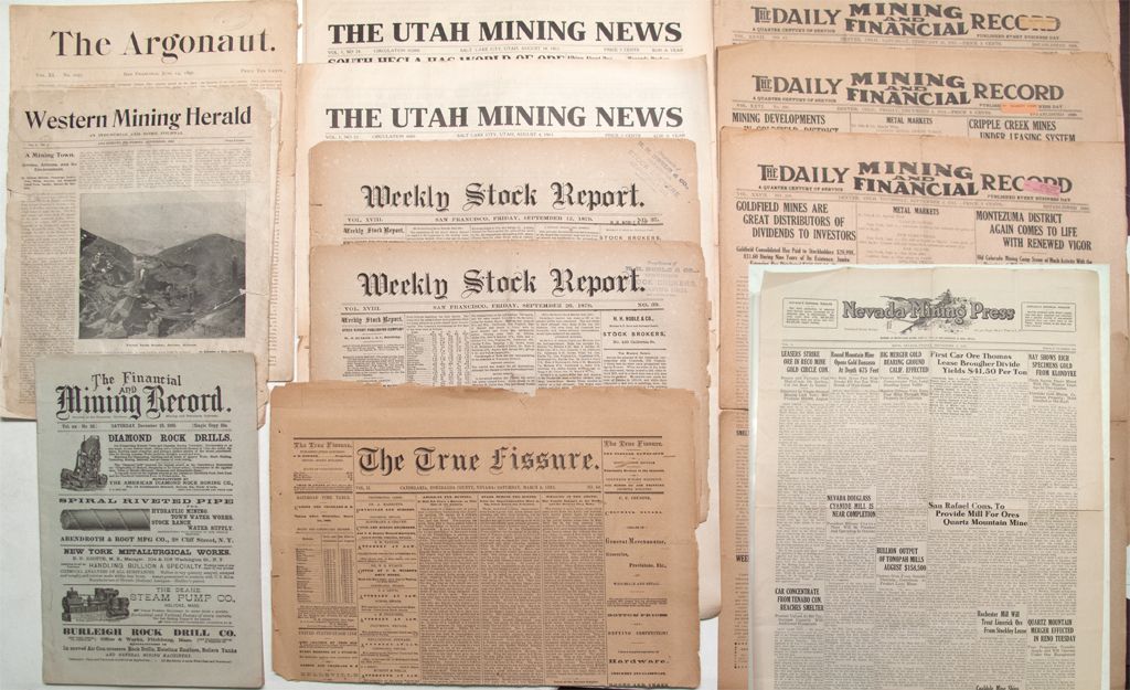 1886 Financial and Mining Record of New York. 1901 Western Mining Herald of Los Angeles. 1882 True Fissure of Candelaria. 1897 Argonaut of San Francisco. 1915 Utah Mining News of Salt Lake City. 1879 Daily Stock Report of San Francisco. 1915 Daily Mining and Financial Record of Denver. 1927 Nevada Mining Press of Reno. Many of these papers have multiple dates. all old newspapers, the paper is very fragile. Due to size, additional shipping fees may be required.