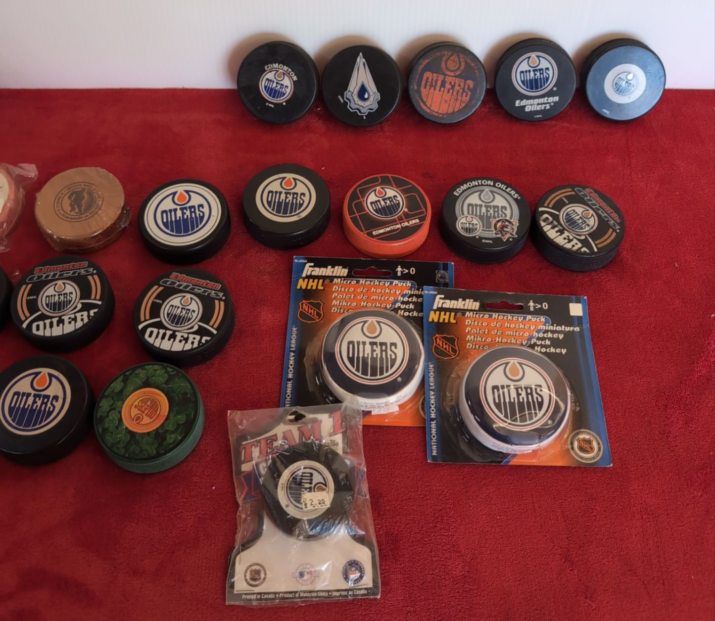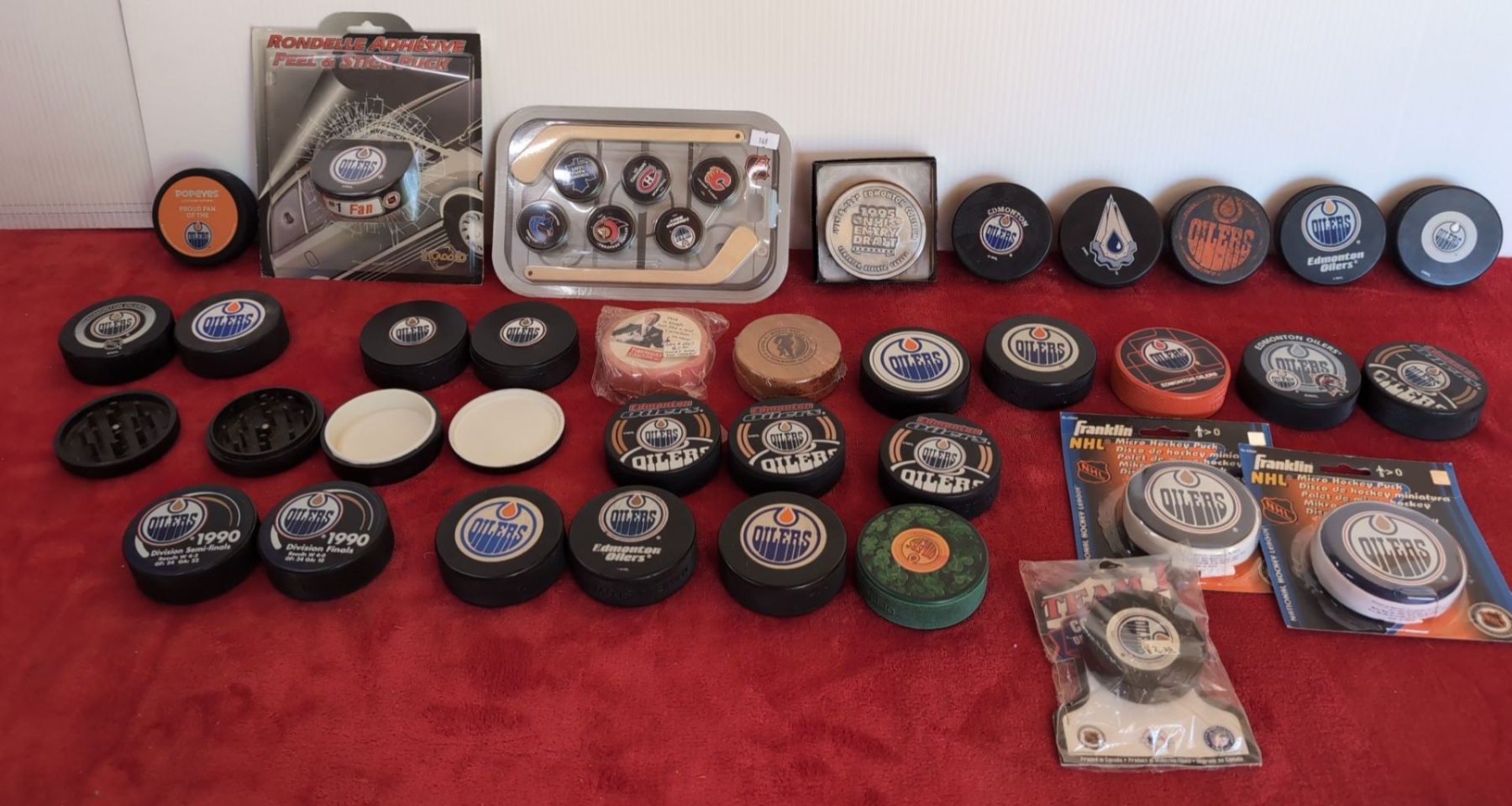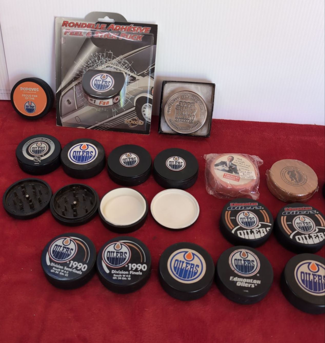 Various Oilers Pucks, Oilers Grinder Puck and Storage Pucks