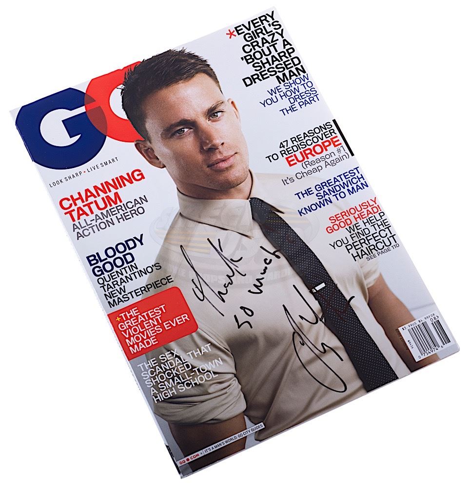This "GQ" magazine is dated August 2009 and features Channing Tatum on the cover. The cover has been autographed by Channing Tatum in black marker. The magazine measures 10.75" x 8" and remains in fine condition.