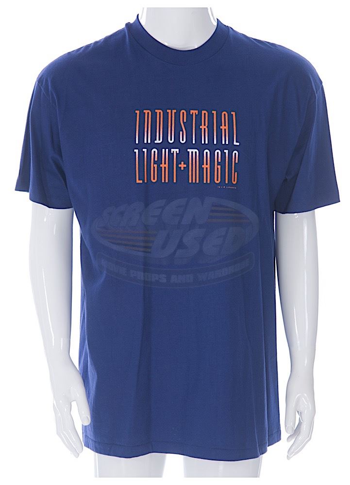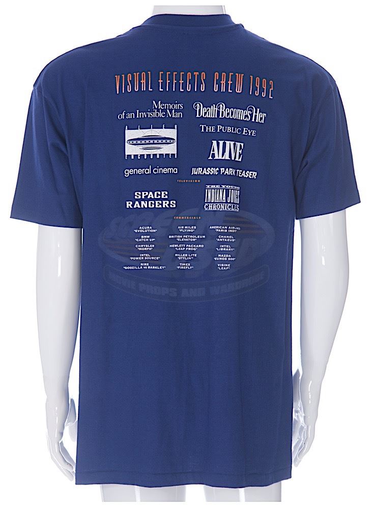 Shirts like this were given to various members of Industrial Light & Magic's 1992 visual effects crew. The size X-large t-shirt features the ILM logo on the chest and logos of the 1992 productions of Death Becomes Her, Jurassic Park Teaser, The Young Indiana Jones Chronicles and others.