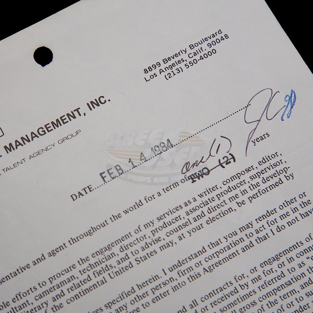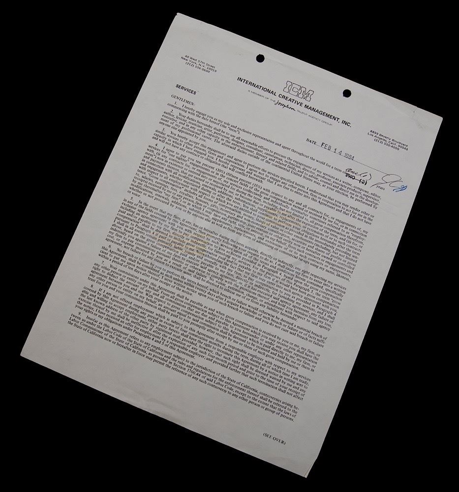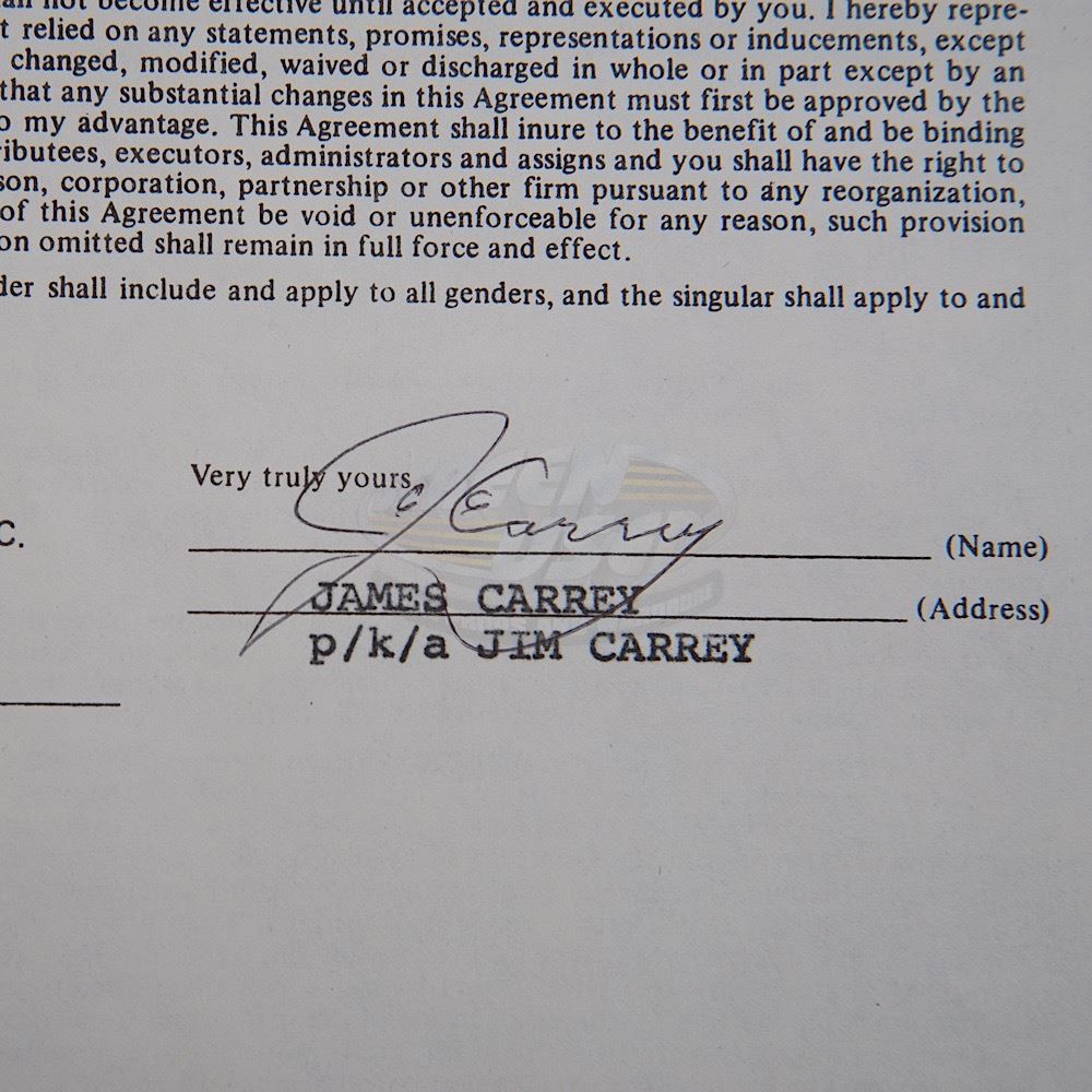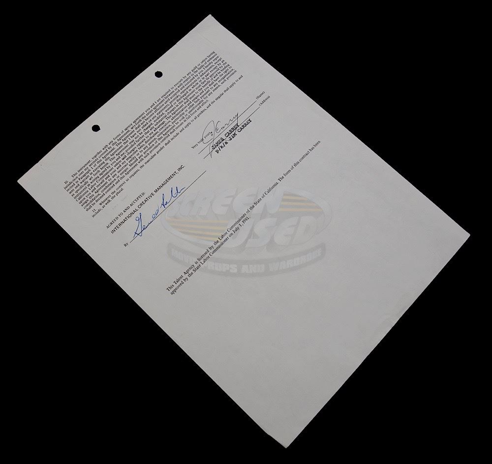 This contract between International Creative Management and Jim Carrey consists of one page (printed on both sides) and is dated 2/14/84 (ten years before the release of his break out role in Ace Ventura: Pet Detective). The contract features "typed in" details on both sides, with a change in the length of the term that required Jim Carrey to initial and is signed in full by Jim Carrey on the back.