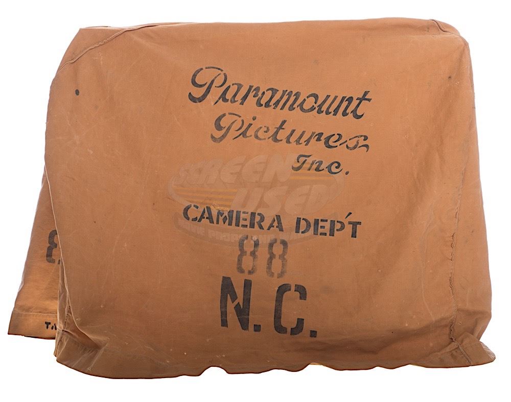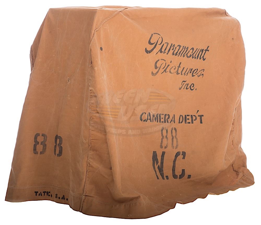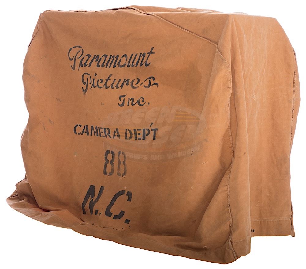 A vintage (90 year old) Mitchell Camera NC88 camera cover used by Paramount Pictures during the production of various films over the years the NC88 was in service. The large canvas cover features the "Paramount Pictures" logo, "Camera Dept" and "88 N.C." printed on both sides. The vintage cover has wear from its years of use by the studio and has seen some action. An extremely rare studio artifact. The cover measures 34" x 32" x 10".