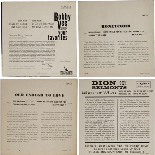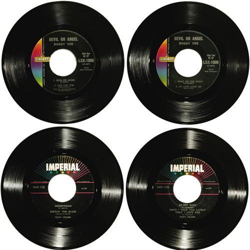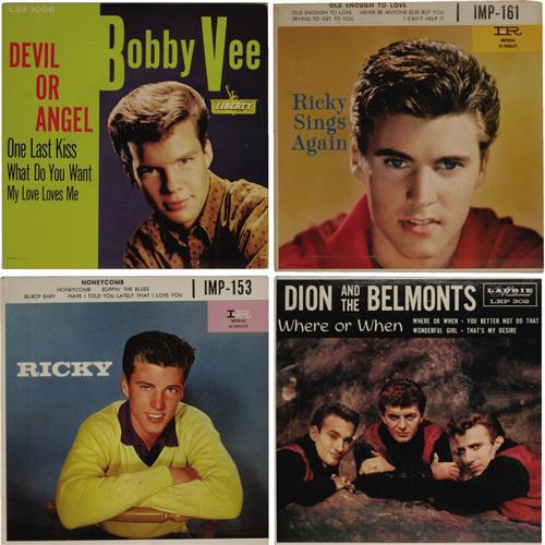 <B>Various Rock 'N' Roll EP Group of 4 (1957-61).</B></I> A supreme quartet of Teen Idol EPs, including Dion and the Belmonts "Where Or When" (Laurie 302, 1959) in EX 7/ MT 9; Ricky Nelson's "Ricky" (Vol. 1 Imperial 153, 1957) and "Ricky Sings Again" (Imperial 161, 1958), both in NM 8/ NM 8; and Bobby Vee's "Devil Or Angel" (Liberty 1006, 1961) in NM 8/ NM 8. <I>From the GRT Collection</B></I>.<BR><BR><b>Shipping:</b> Recordings (<a target="_blank" href="http://www.heritageauctions.com/common/shipping.php">view shipping information</a>)