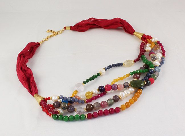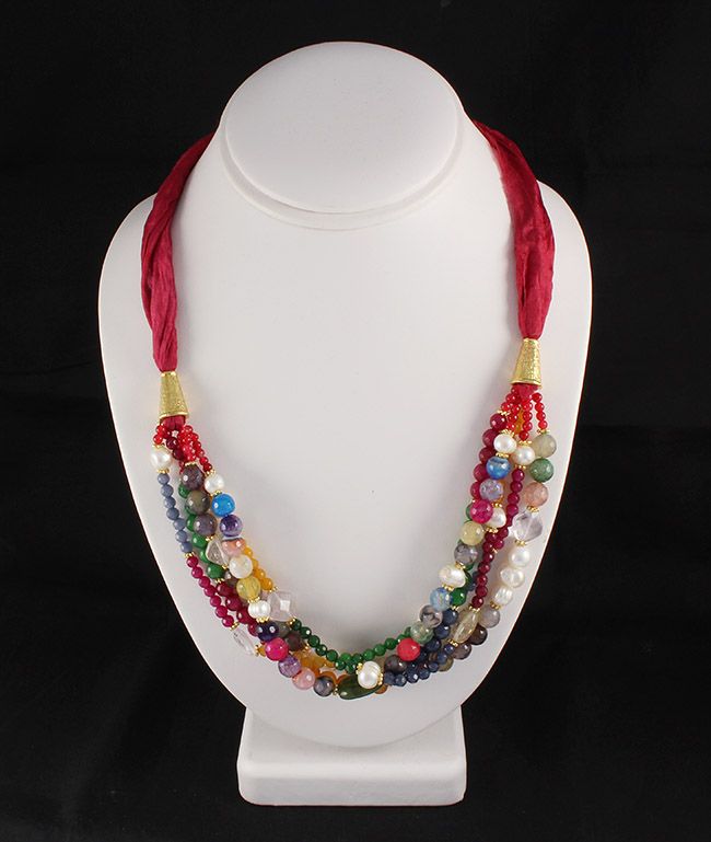 Various Semi Precious Gemstone Handmade Crafts Necklace **|**|** 400.00CARAT Handmade Necklace w/ Various Semi Precious Stones; 100% Red Silk layered in buttery 24k over brass VERY UNIQUE ; MSRP: $0