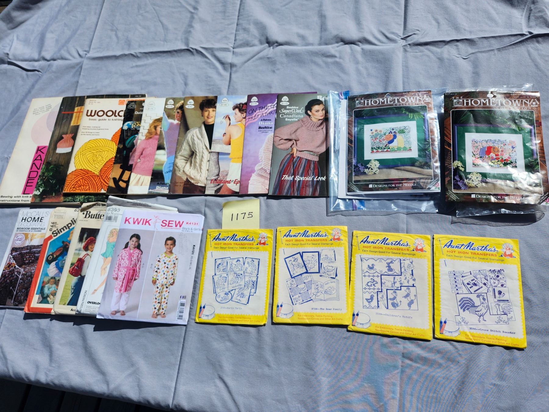 Various Sewing, Knitting, Crocheting patterns, Two Cross Stitch Kits, Vintage Hot Iron Transfers