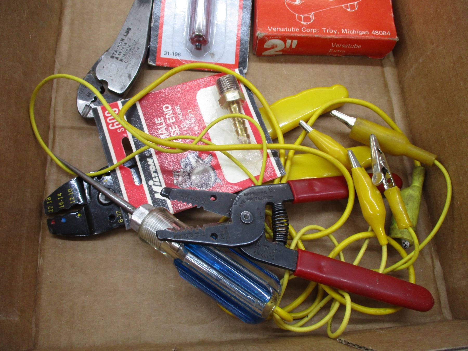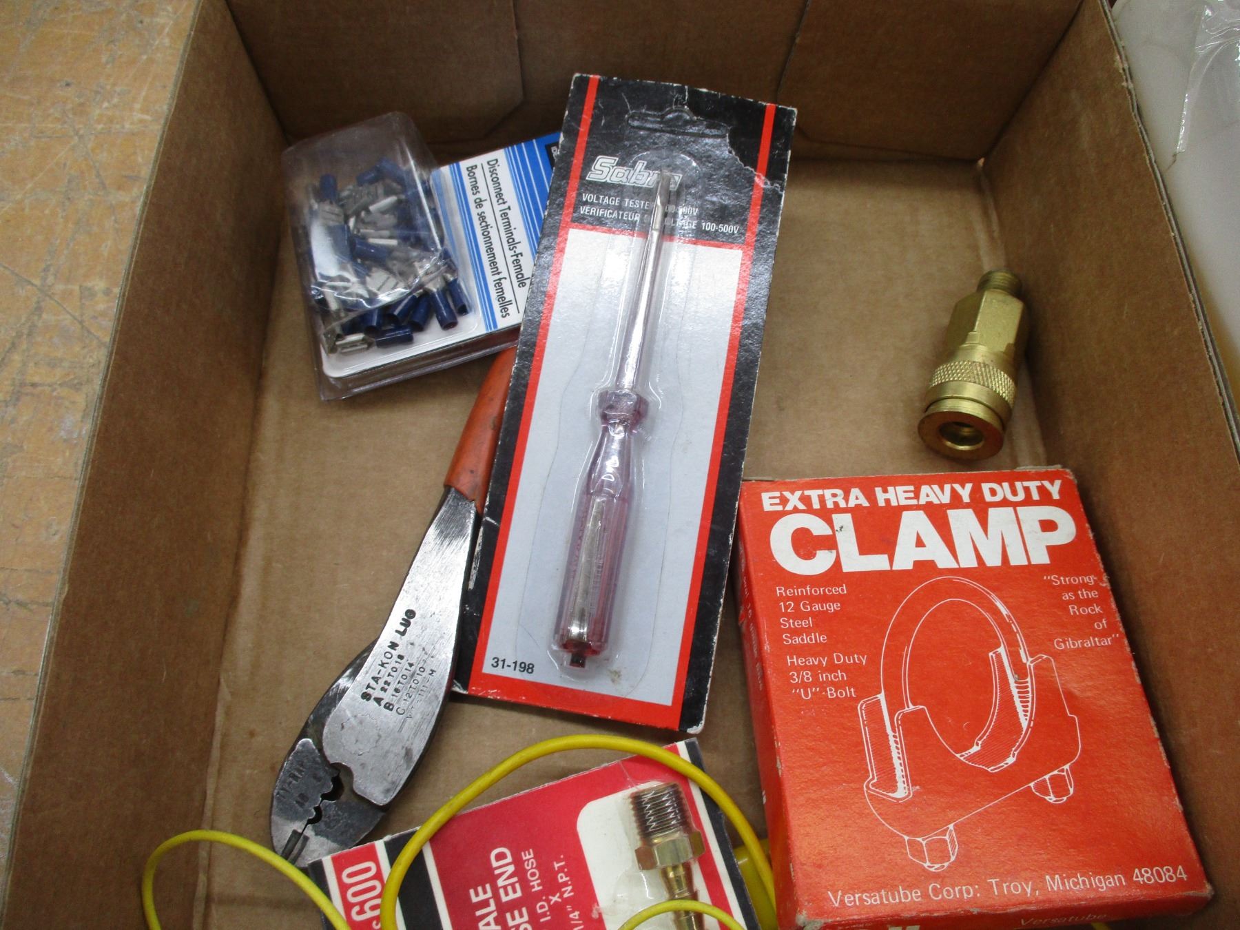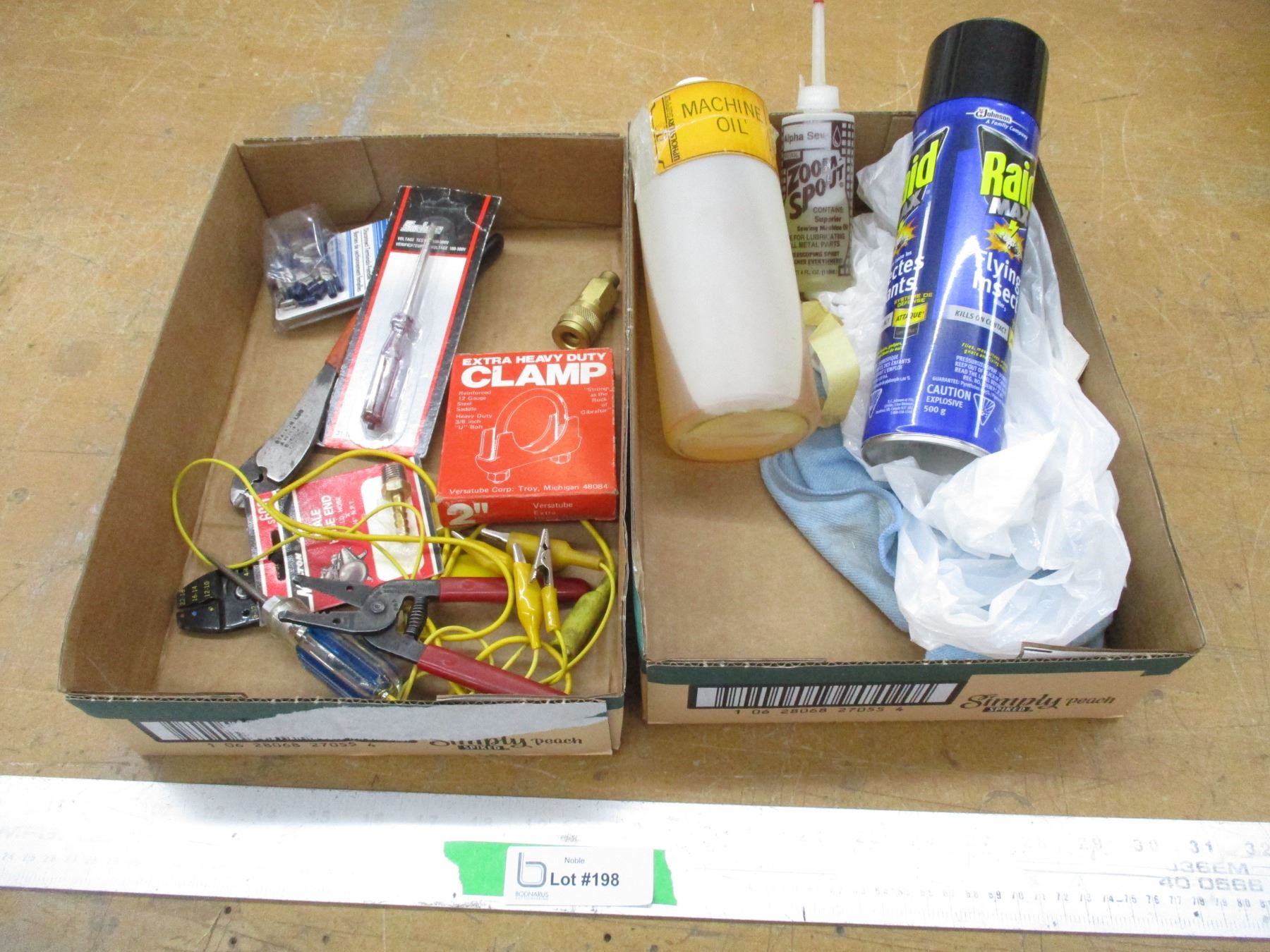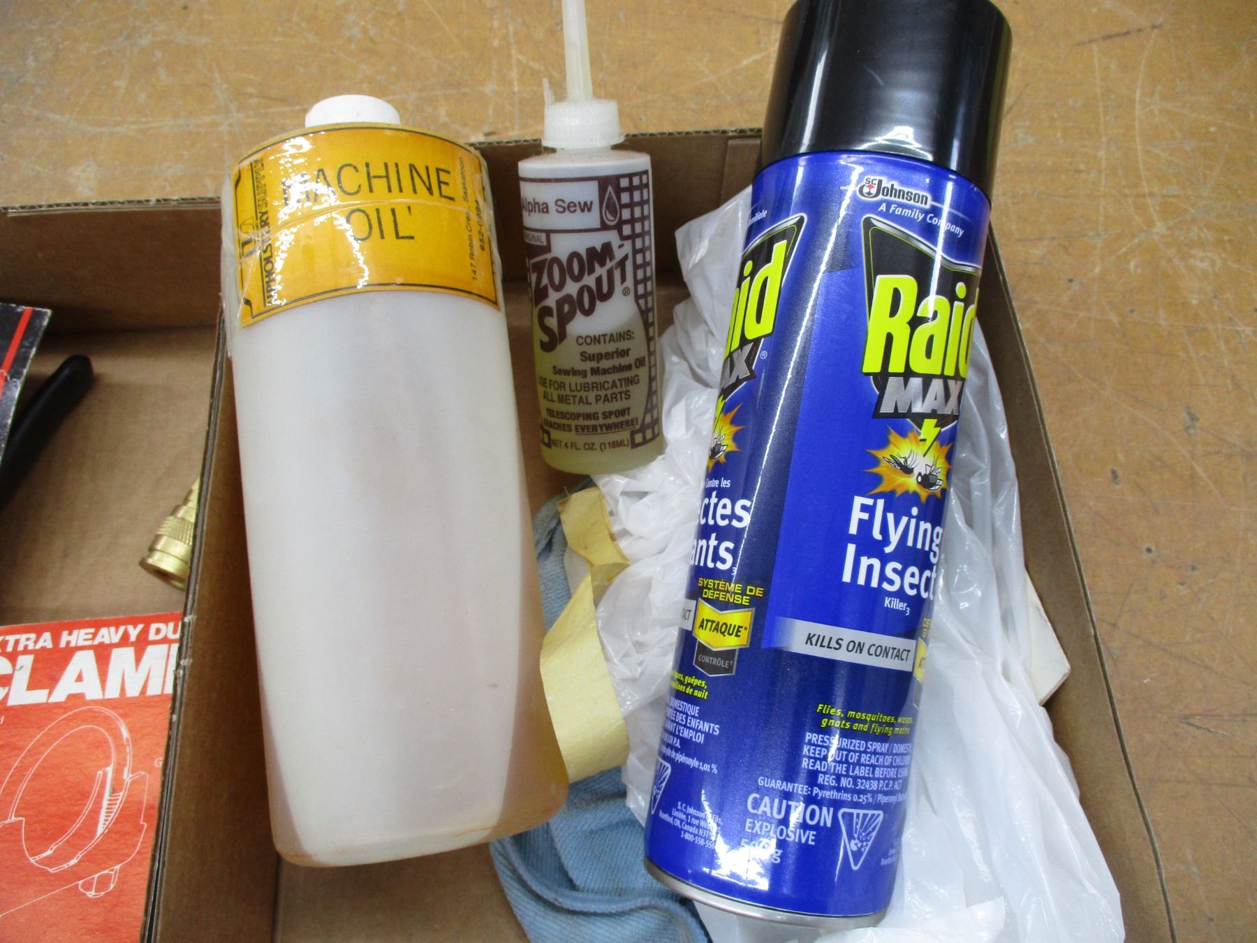 Various Shop Items - C-Clamp, Electrical Leads, Strippers, Terminals, Sewing Machine Oil, Raid etc.