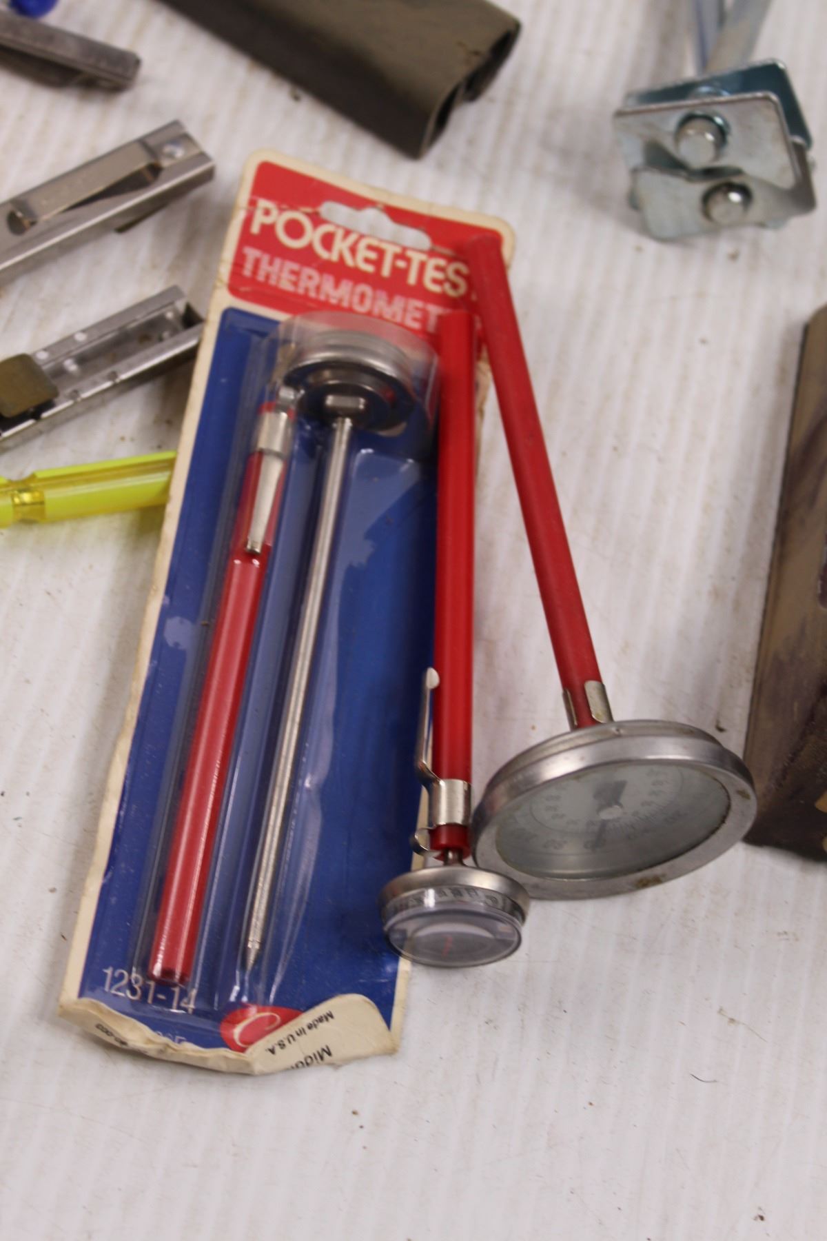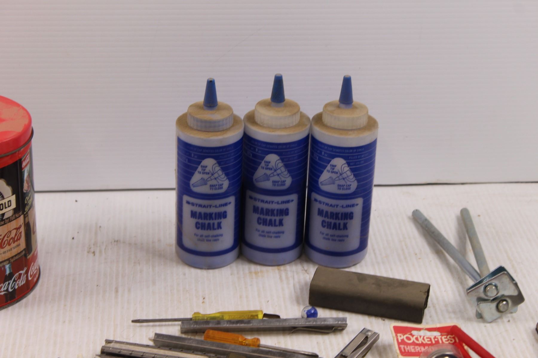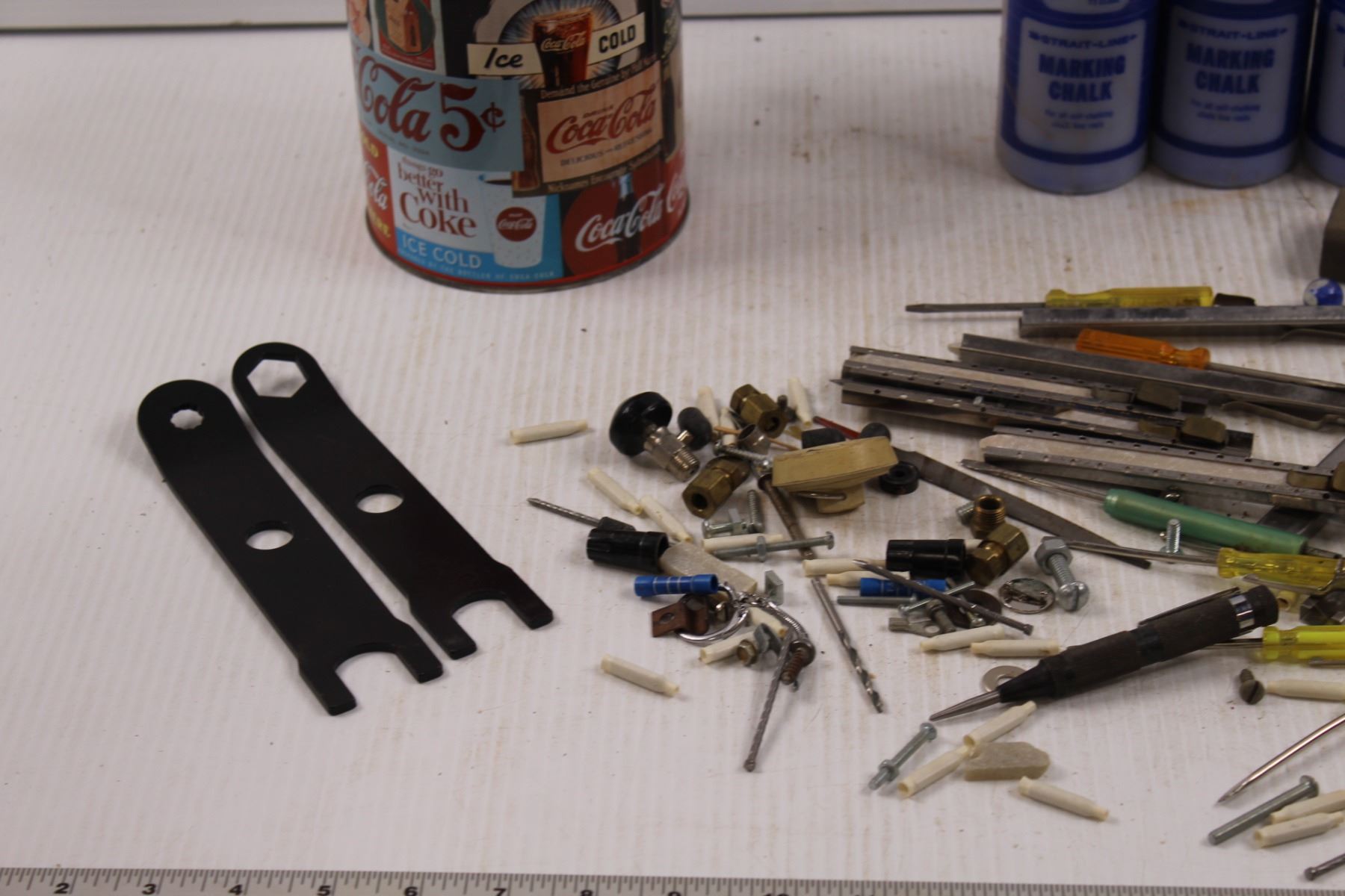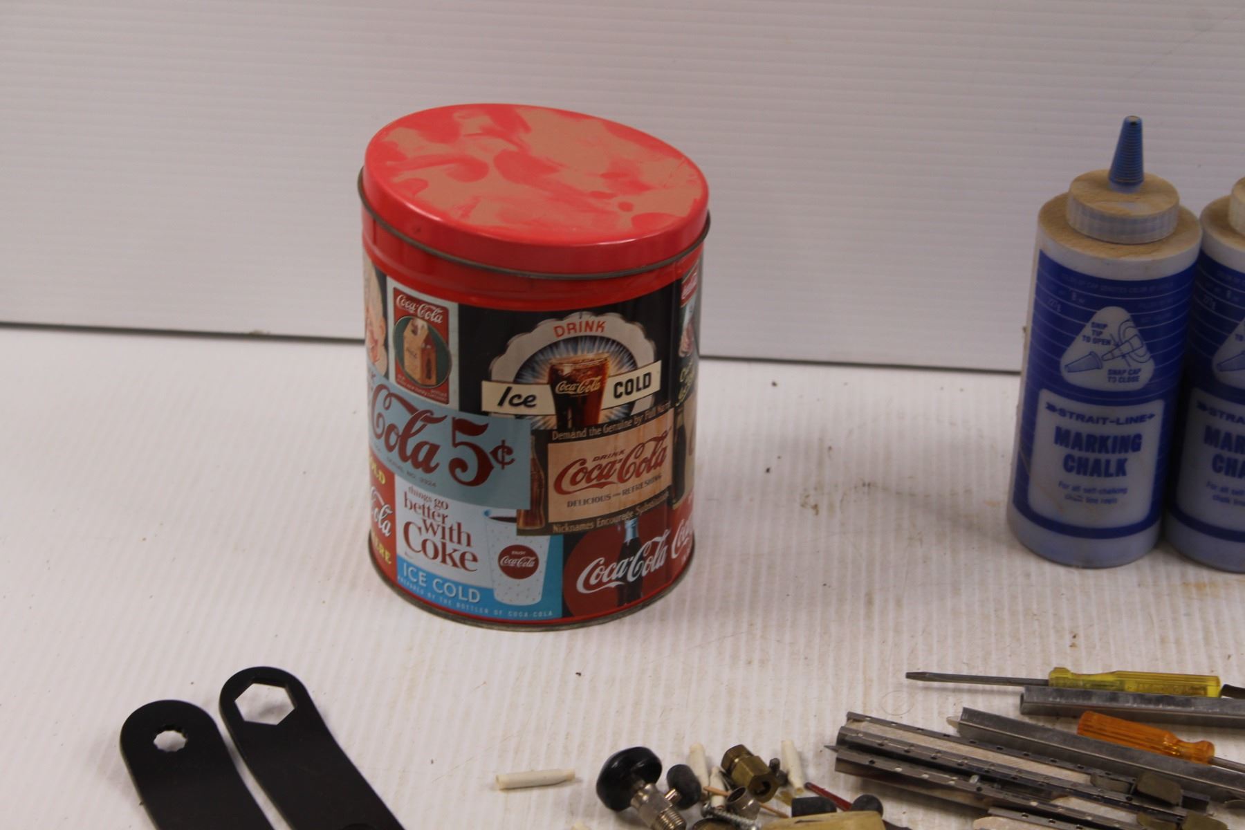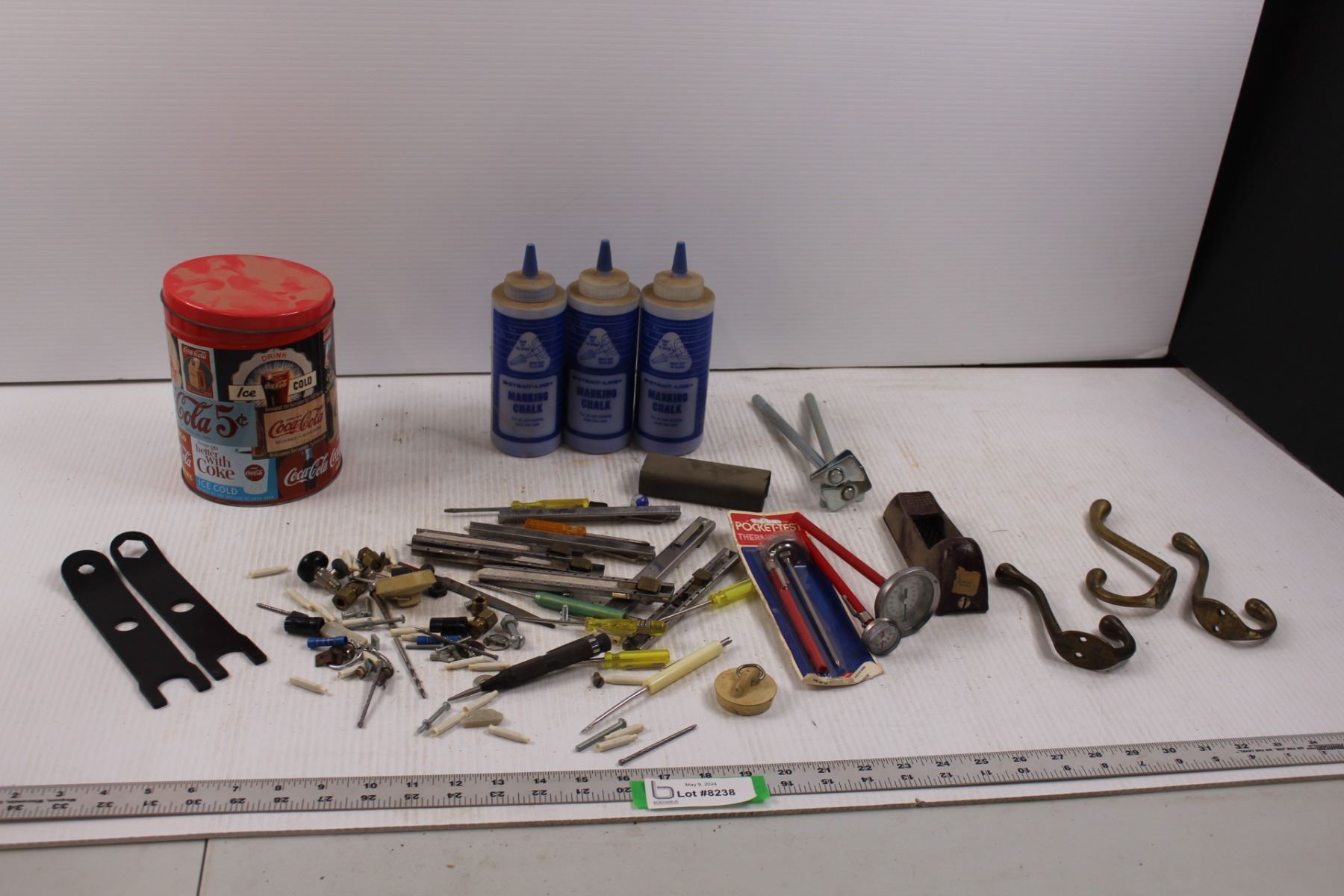 Various Shop Items - Coca-Cola Tin, (3) Partial Bottles Marking Chalk, Pocket Test Thermometers, (3) Brass Hooks, Soap Stone Markers, Small Files, Stanley Rasp etc.