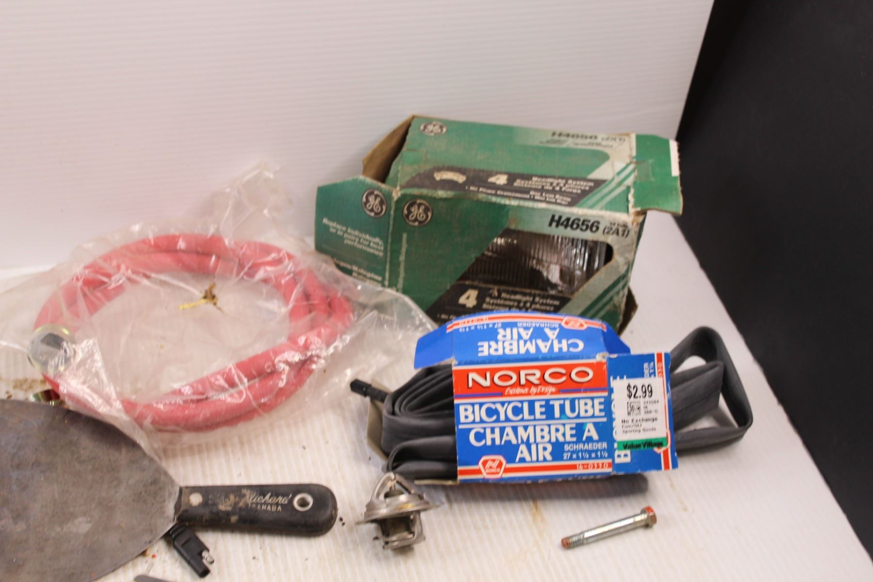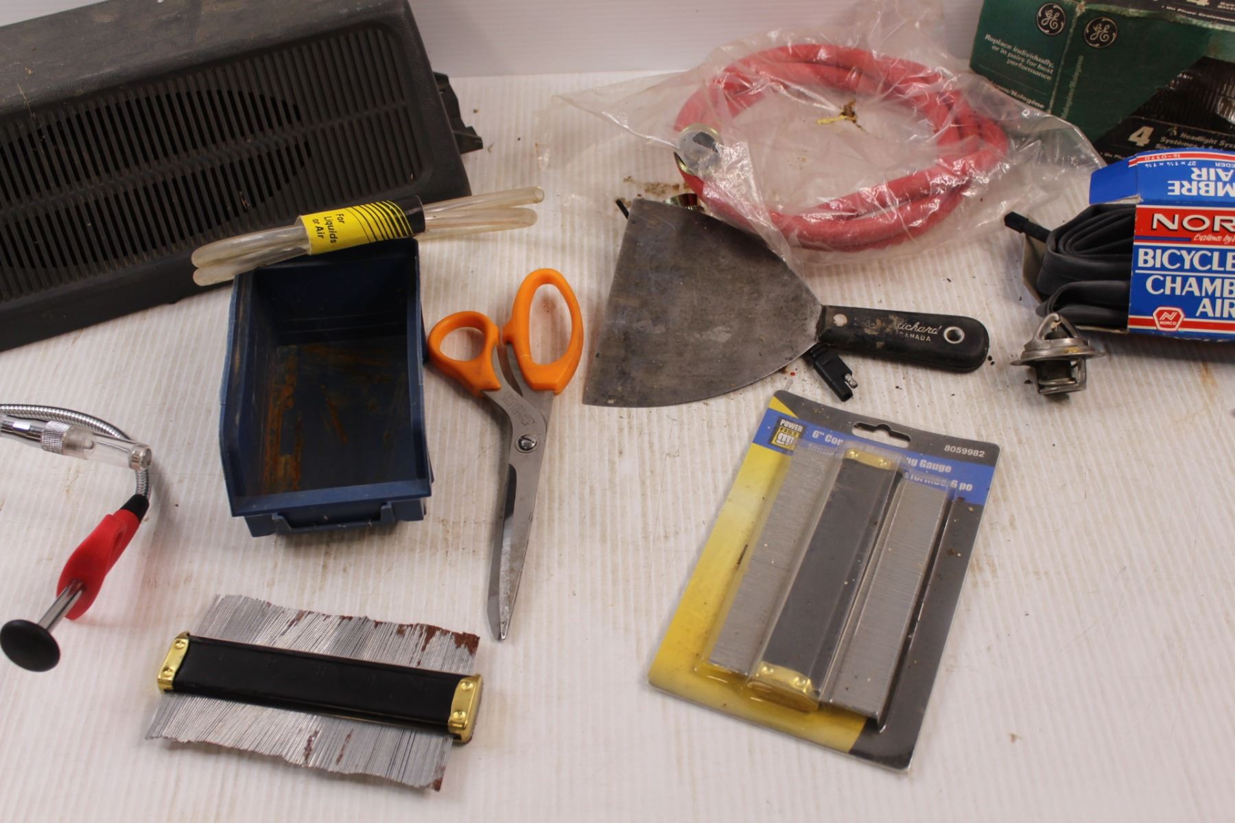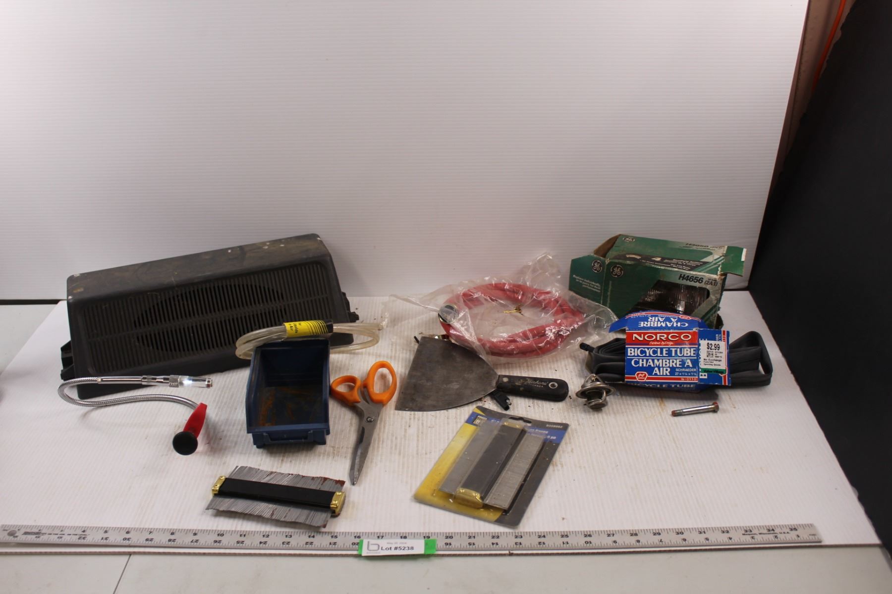 Various Shop Items - Flexible Lighted Magnet, Speaker In Box, Contour Gauges, Scissors, Bolt Bin, Bicycle Inner Tube, Hose, Halogen Head Light Bulb etc.
