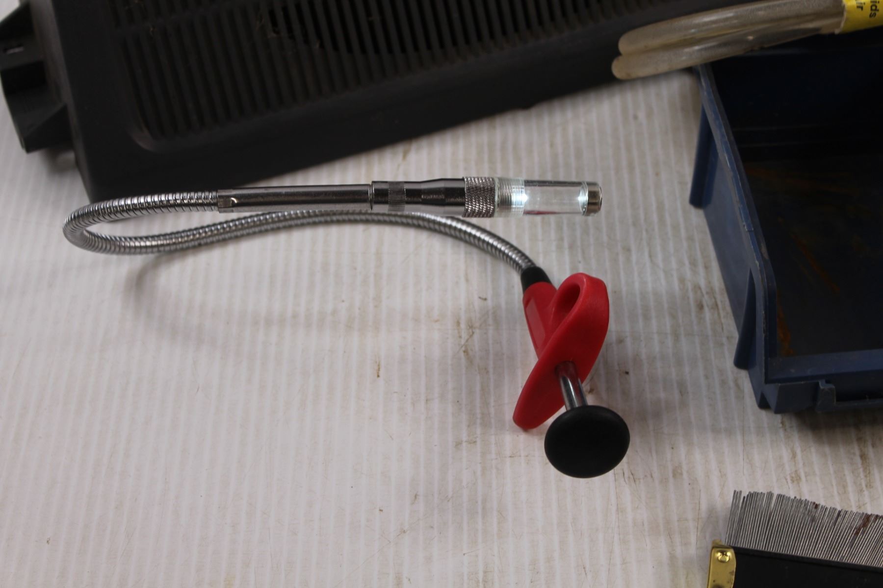 Various Shop Items - Flexible Lighted Magnet, Speaker In Box, Contour Gauges, Scissors, Bolt Bin, Bi