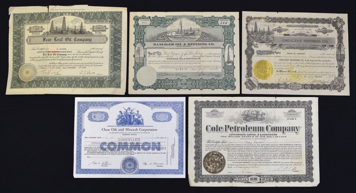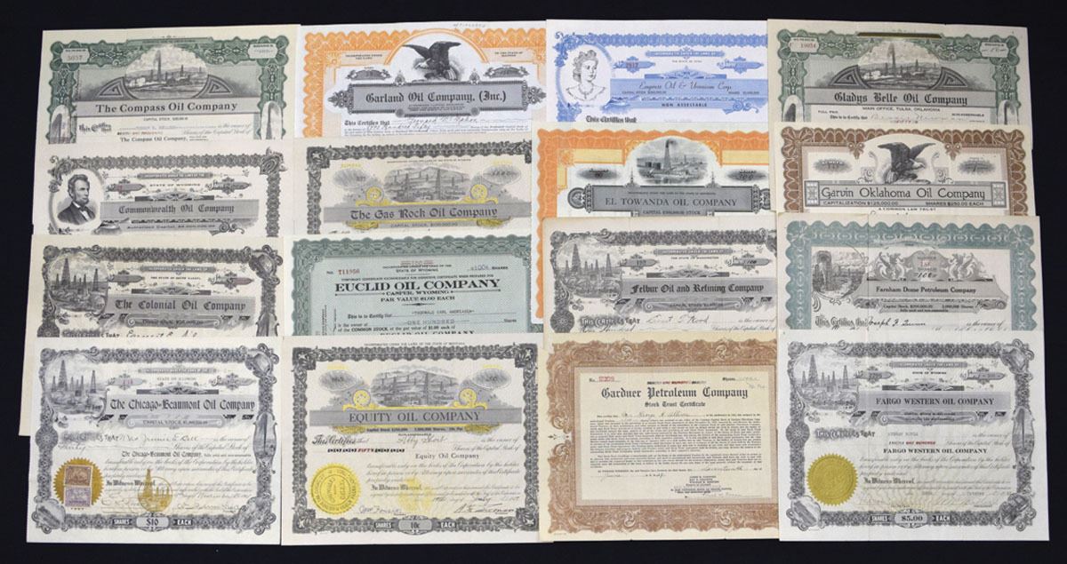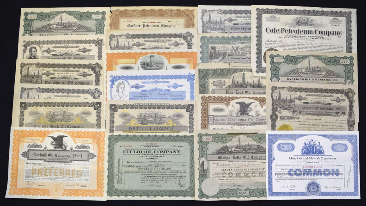 Various States, ca. 1910-650s. Lot of 20+ I/U and I/C oil, refining, and petroleum certificates with classic engraved vignettes of oil derricks, refineries, allegorical figures, and industrial motifs. Highlights include: Cole Petroleum Co.; Compass Oil Co.; Garland Oil Co.; Crescent Refining Co.; Danciger Oil & Refining Co.; and Chase Oils & Minerals Corp. Certificates appear in a variety of colors including green, orange, blue, and brown, with both common and preferred issues represented. Condition ranges VF to XF with folds, punch and ink cancellations, and light handling. (20+). Sold "AS IS" no returns accepted.