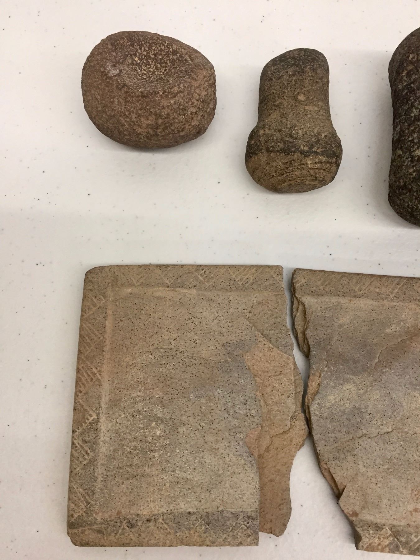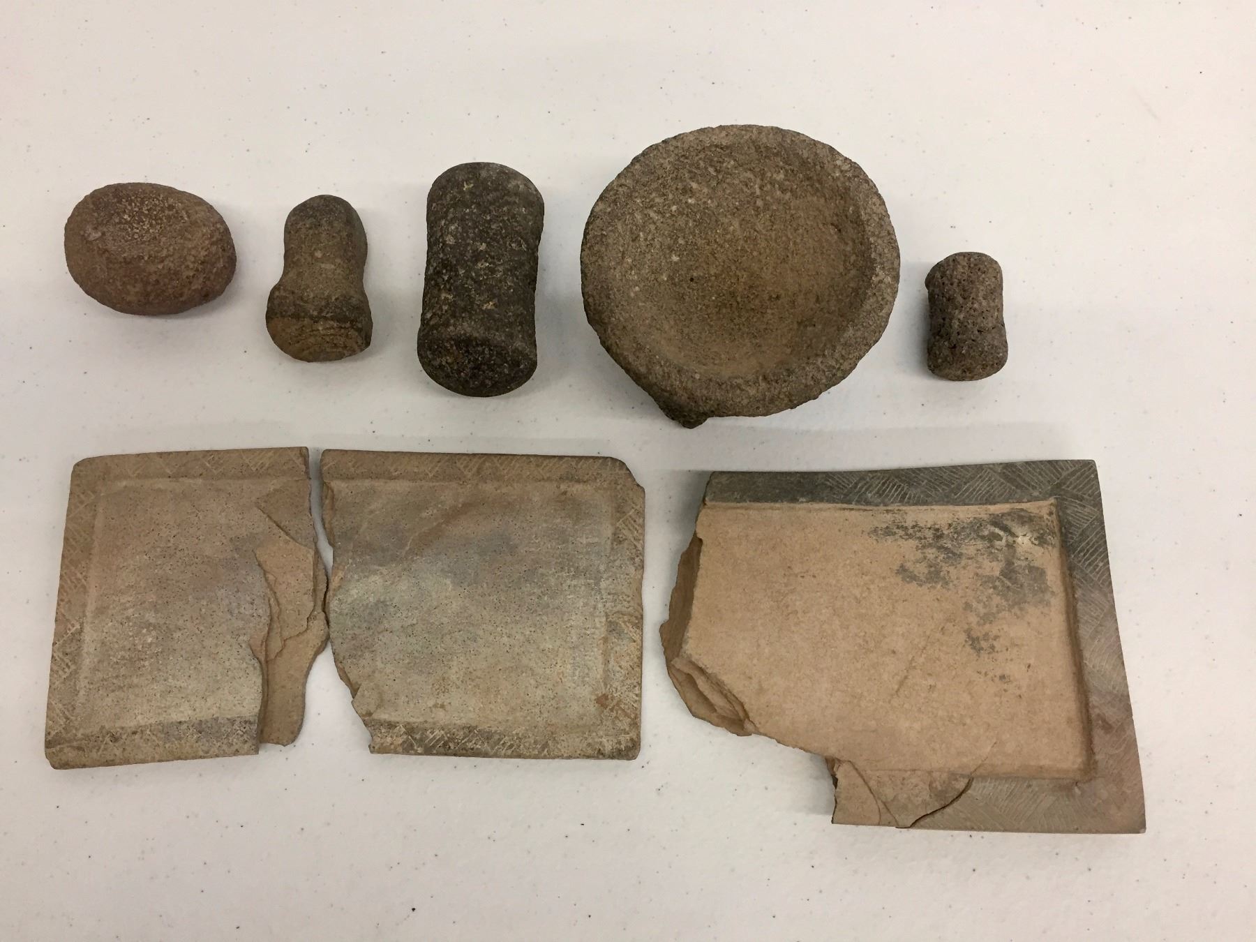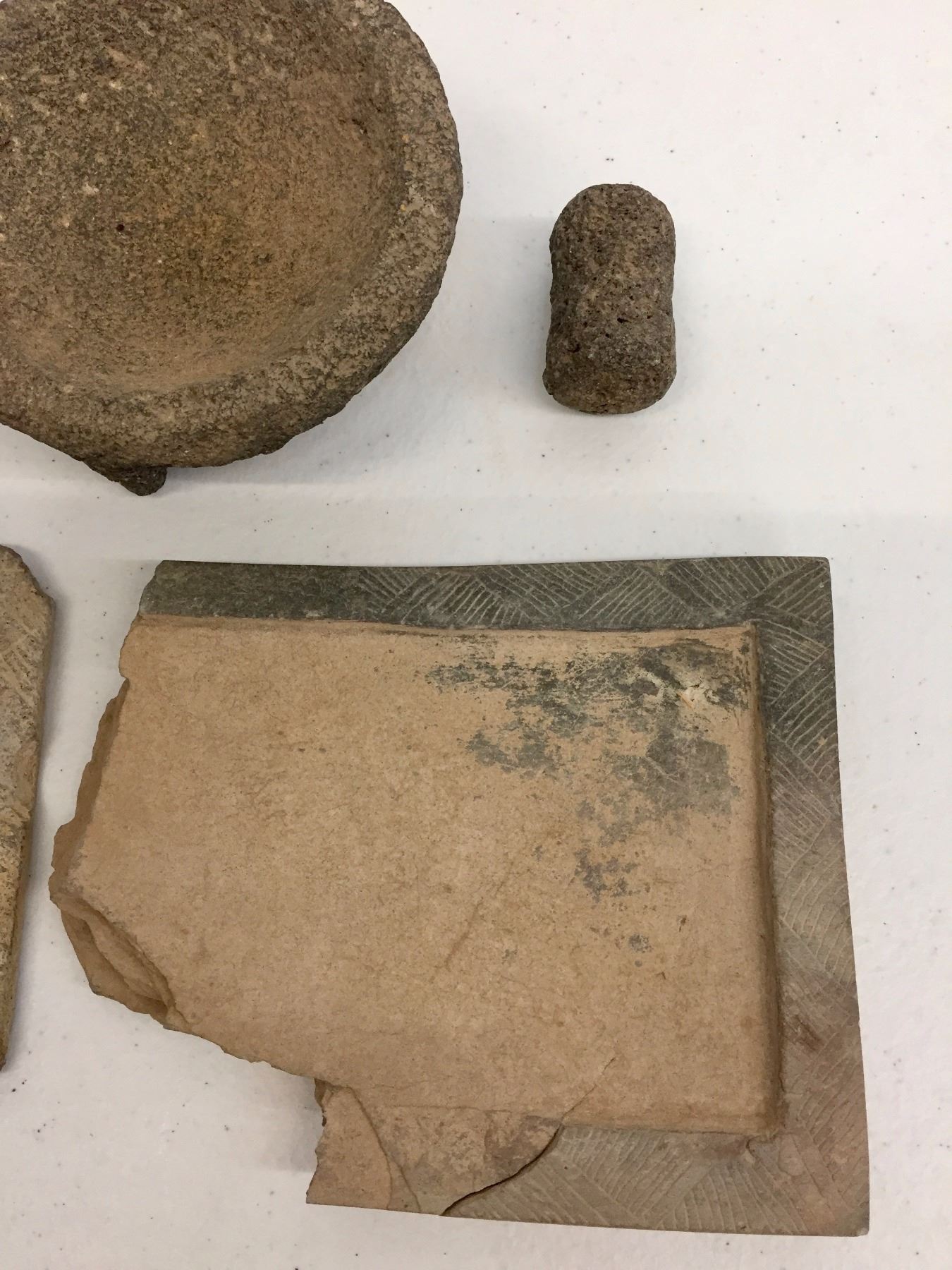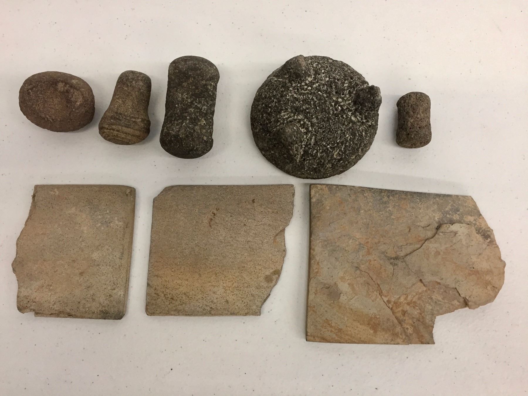 Description: Various stone artifacts including two paint palettes, both been broken, and other various stone artifacts. Most of these were found in the Coolidge, AZ area, but the little mortar bowl is from Mexico. Maker: Various, mostly appear to by Hohokam. Approx. Age: Mostly prehistoric. Size: Varies. Condition: AS FOUND, wear expected. Please look closely at the pictures - they are an important part of our description. Shipping: There will be a $8 handling / packaging fee for shipping this lot. The actual cost of postage will be added on top of that.