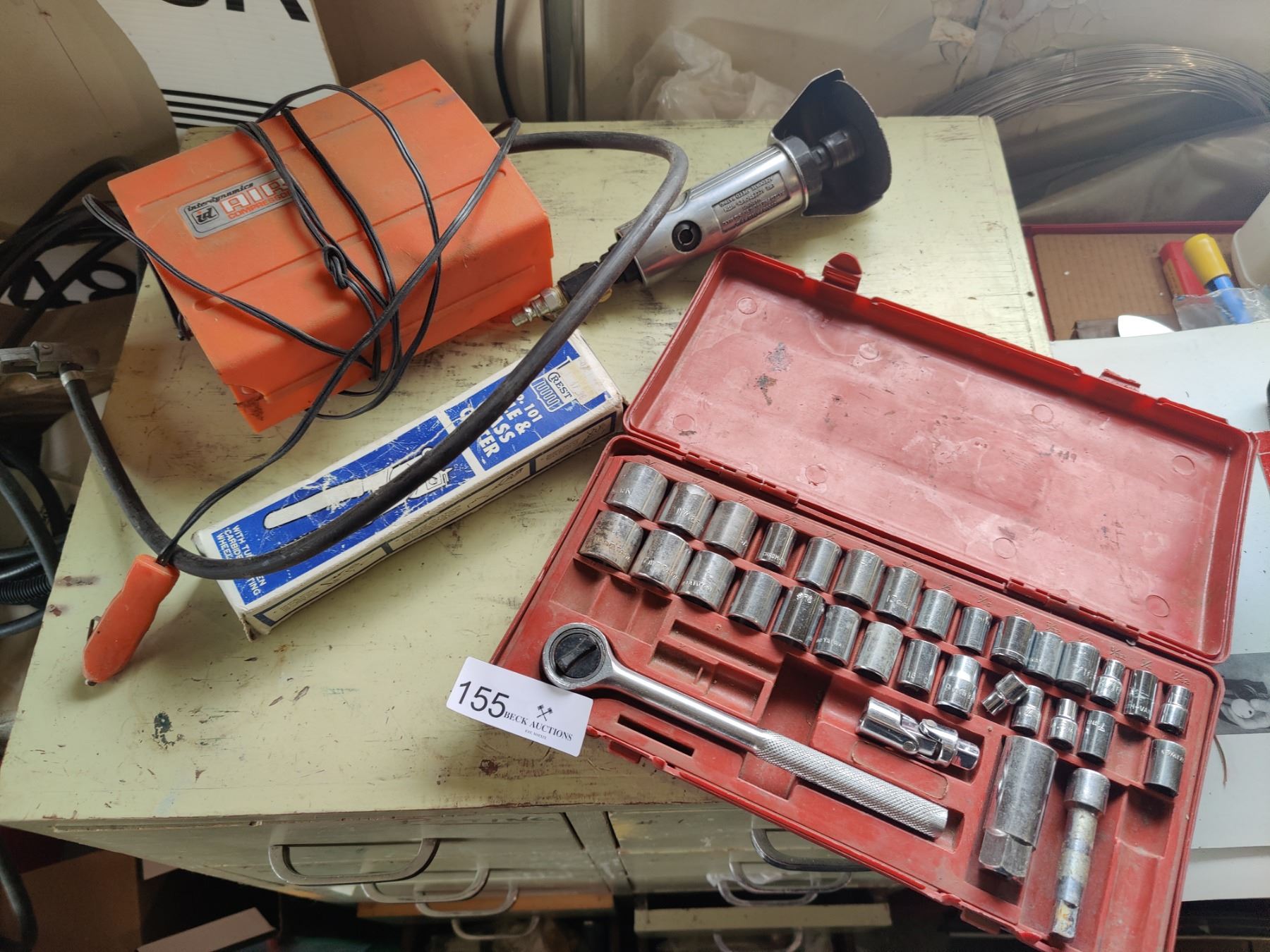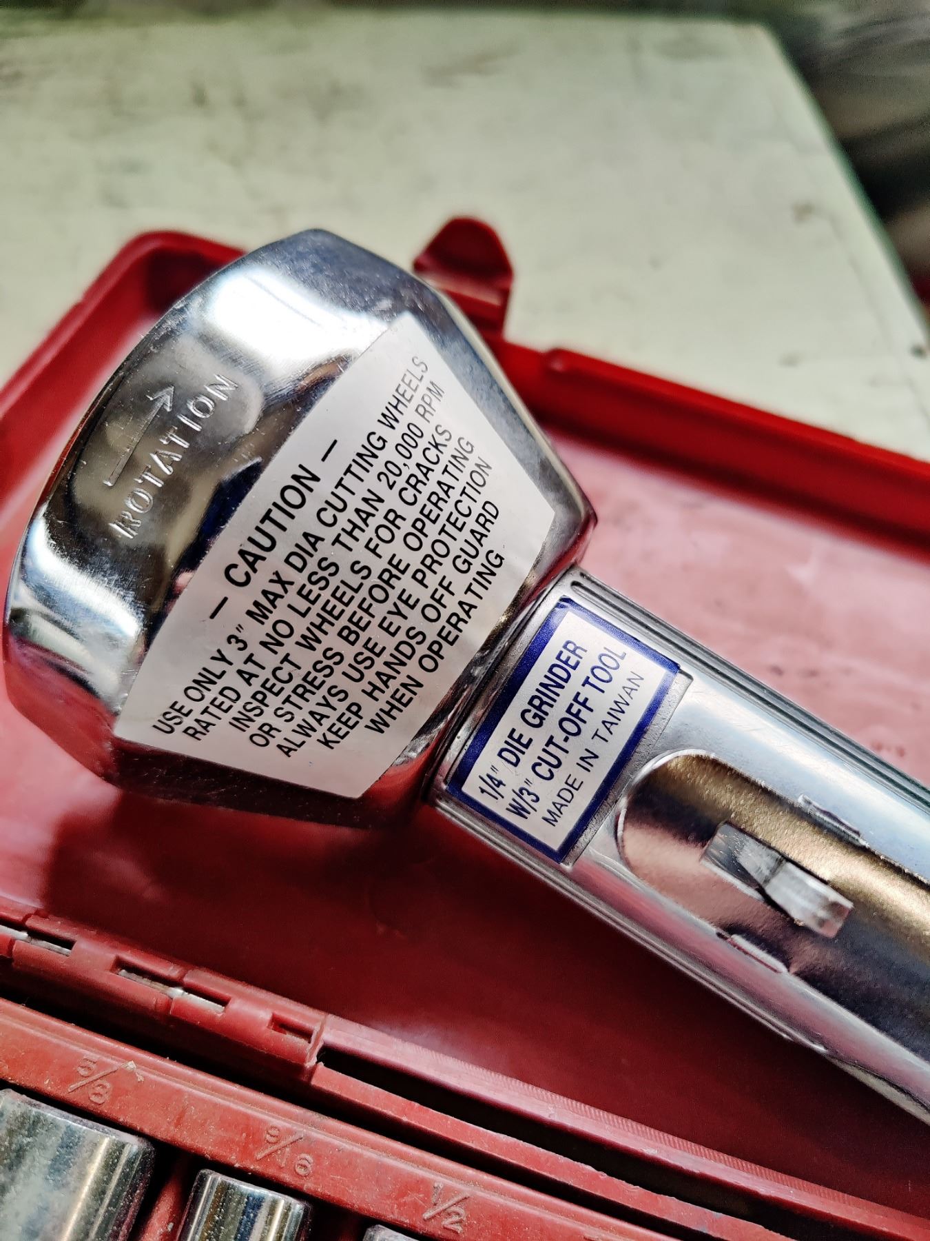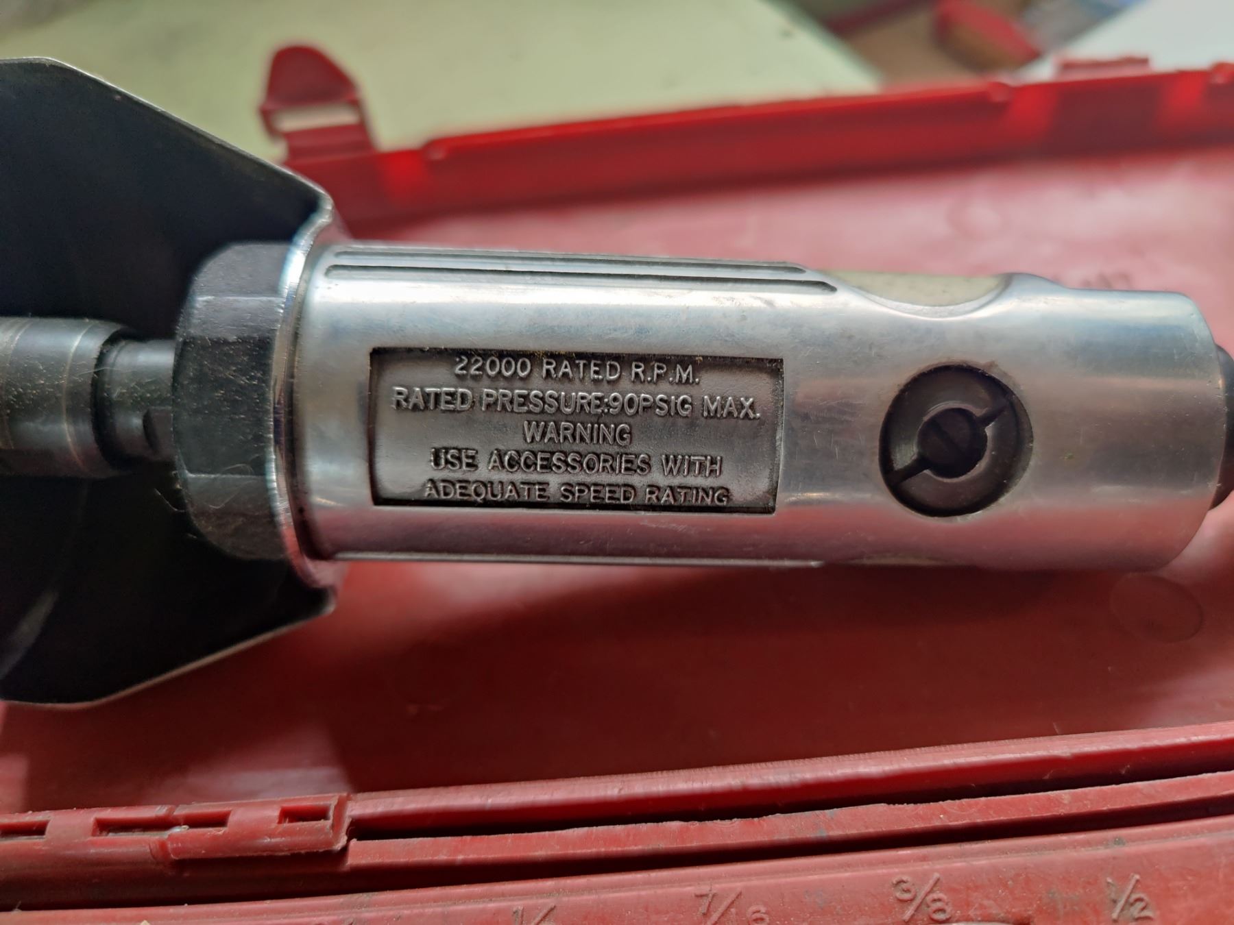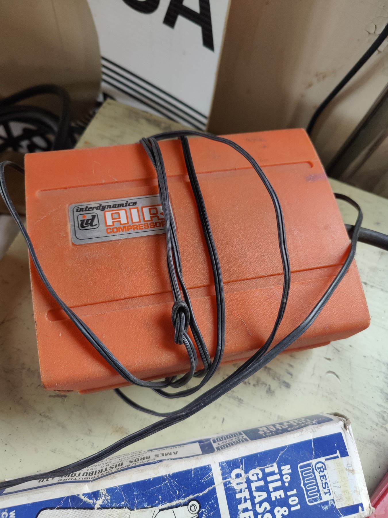 Includes the following: Silver 1/4" die grinder. Tile and Glass cutting tool. Interdynamics Air Compressor with no model number. Socket Set.