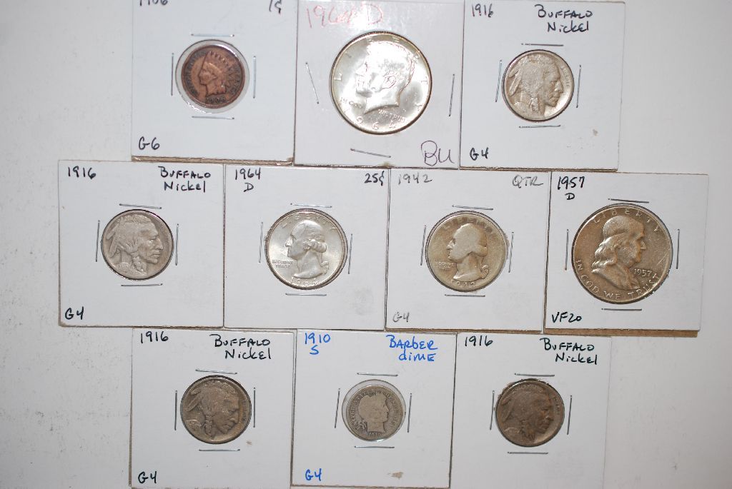 Various US Coins; Indian Head One Cent, Bufflo Nickel (4), Barber One Dime, Washington Quarter (2), Ben Franklin Half & Kennedy Half; Lot of 10; EST. $60-80