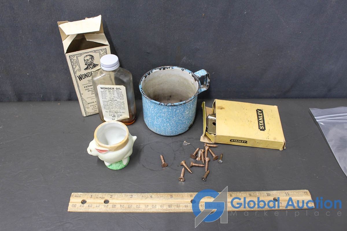 Emamel Cup, Stanley Hardware, Wonder Oil Bottle (in original box), etc