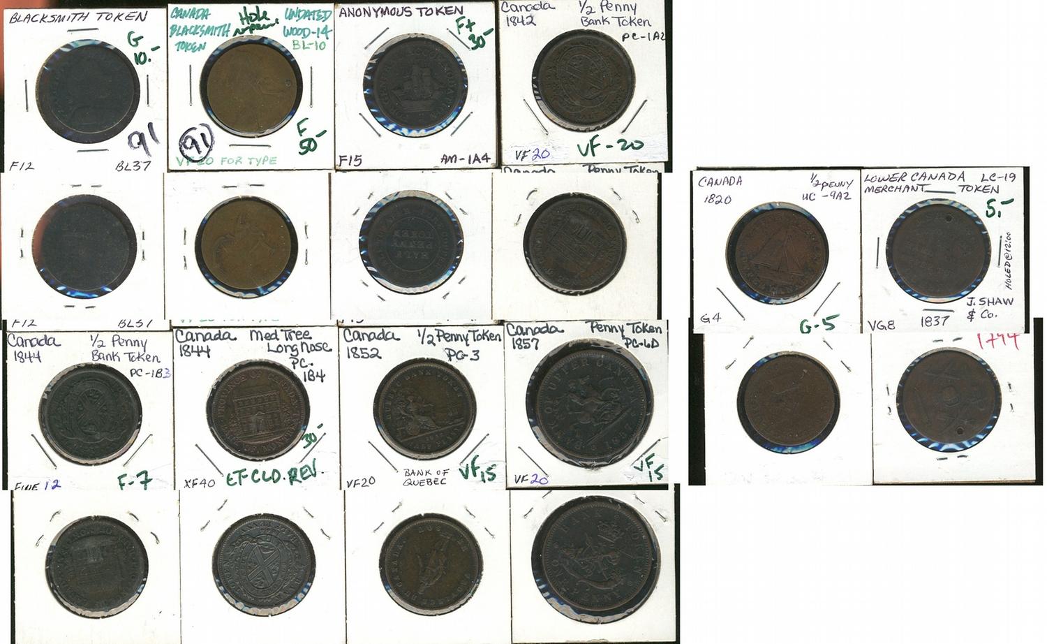 Various colonial tokens, includes two blacksmiths. Good to EF. Lot of 10 pieces. Should be viewed.