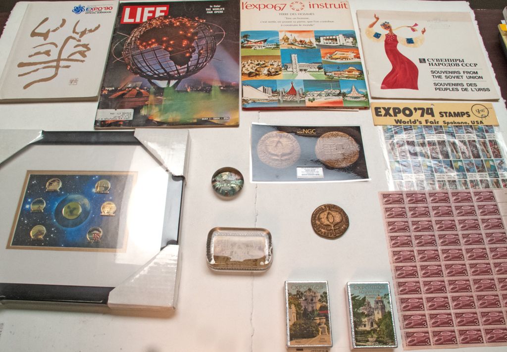 1) Expo 1974 in Spokane: stamps. 2) Expo-67 education kit. 3) Expo 67 souvenirs from Soviet Union. 4) Two sets of playing cards from San Diego. 5) Expo 90 official guide book. 6) Sheet of 3c 1958 United States Pavilion postage stamps. 7) Life Magazine on 64 expo. 8) 1885 Crystal Palace glass paper weight. 9) Jamestown Exposition glass paper weight from 1907. 10) Framed and numbered (57 of 2500) pins from Hannover 2000 (London 1851, Vienna 1873, Paris 1889, New York 1939, Brussels 1958, Osaka 1970). Seven pins in all. Etc.City: County: State: