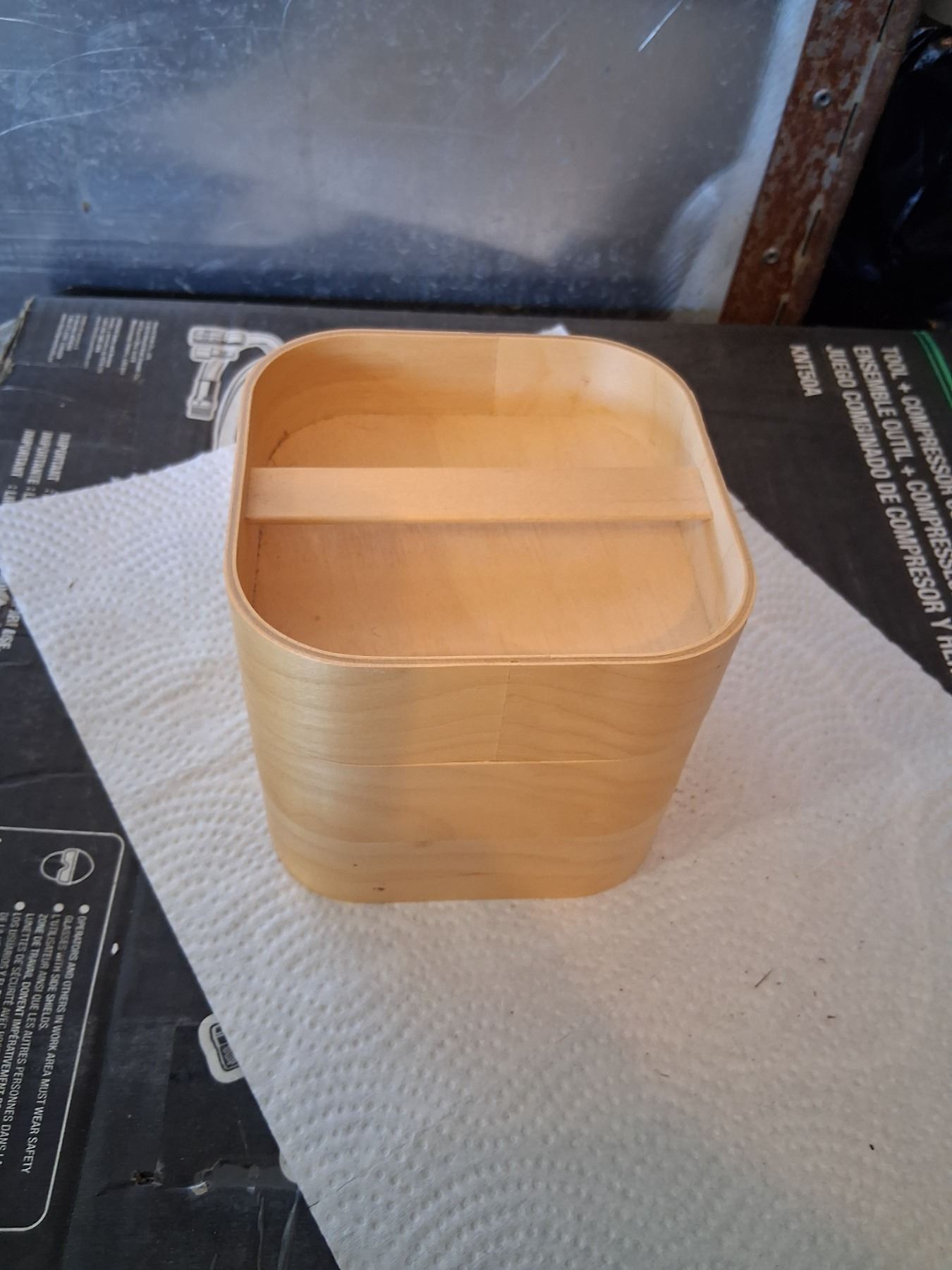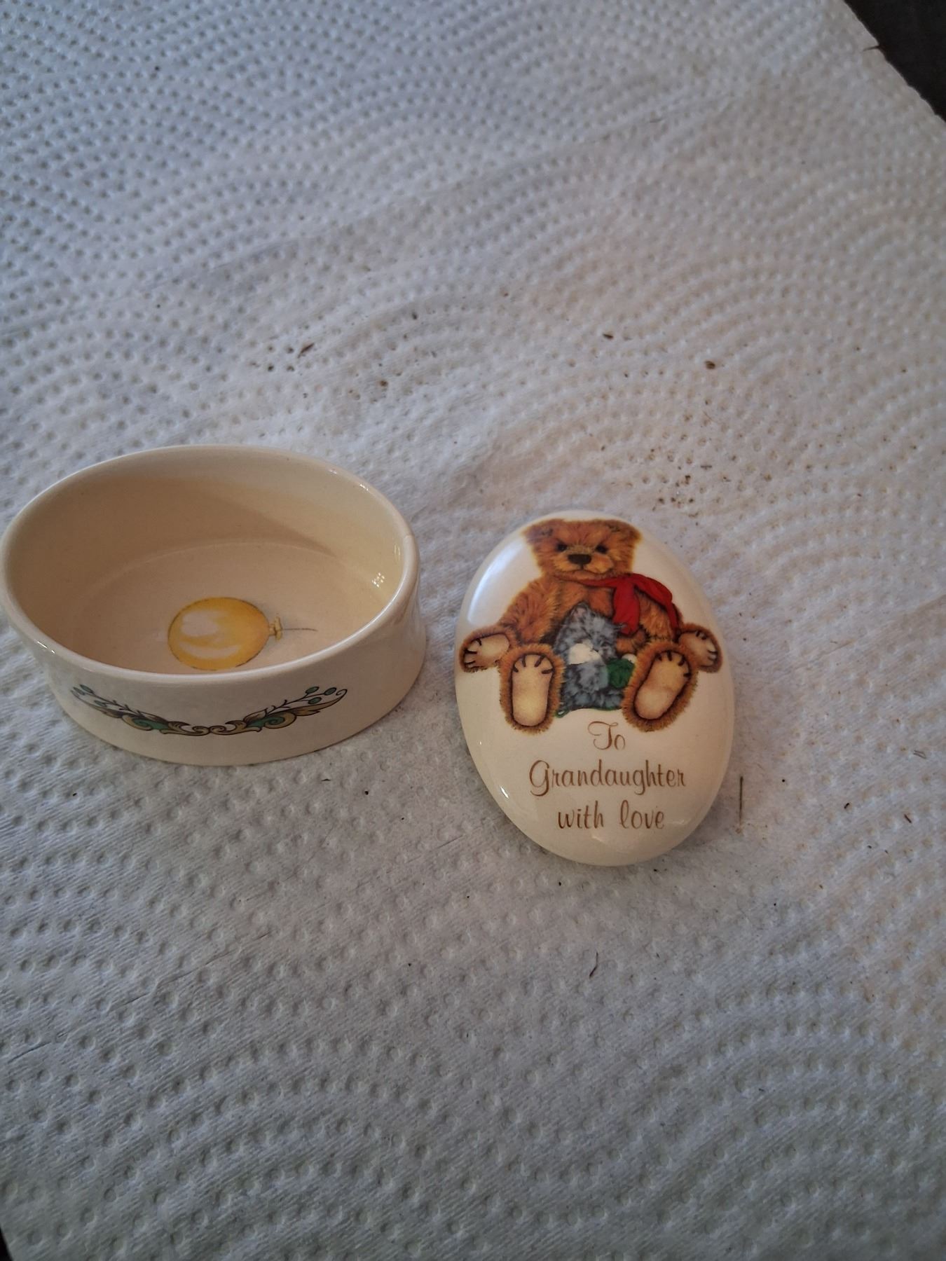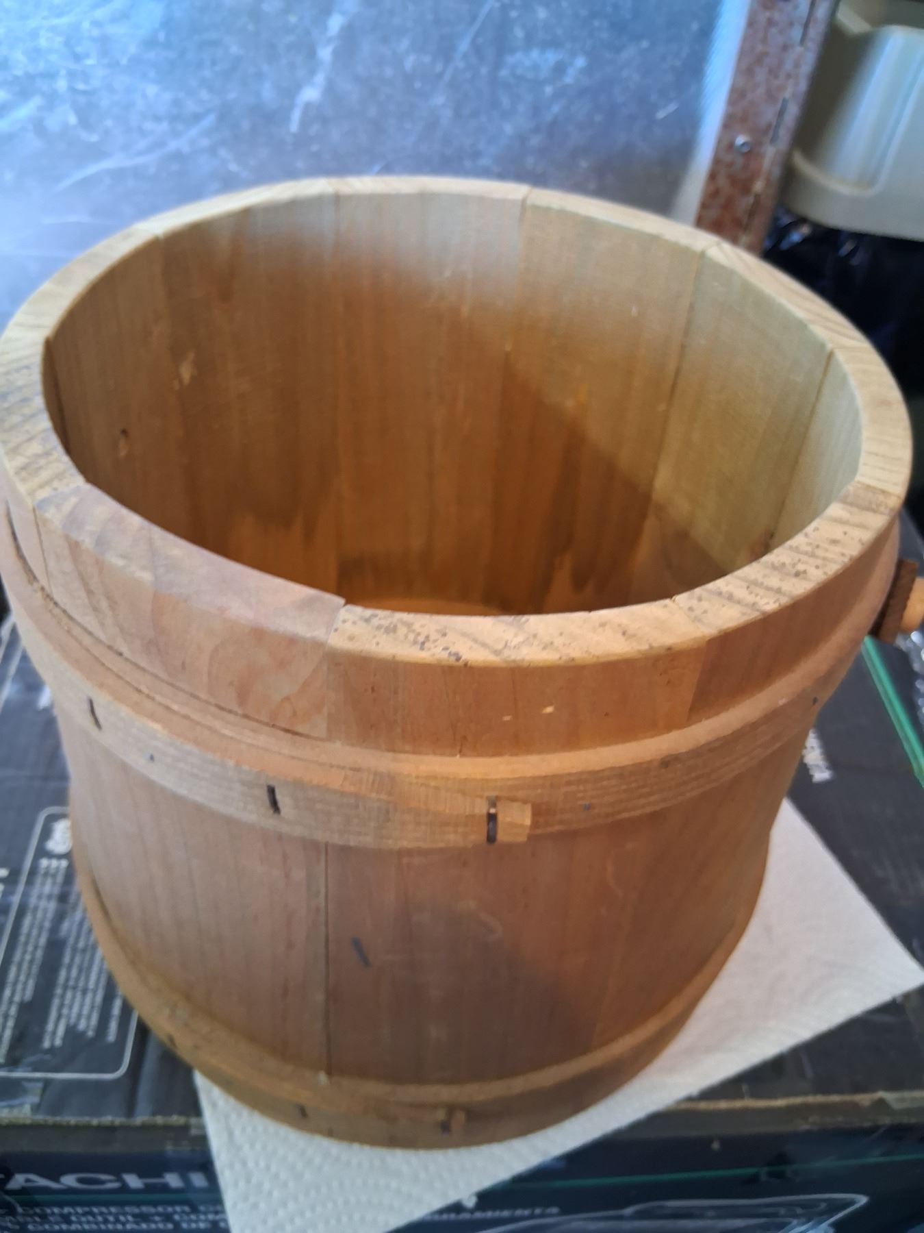 Wooden sauna water bucket, Ceramic Snowman Planter, Metal plant stand, misc. pins