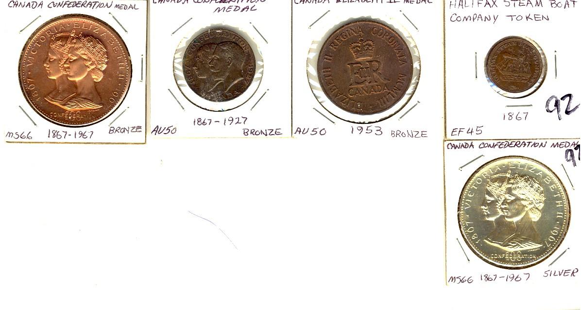Various token and medals. Includes Breton 900 Halifax Steam boat EF, and four different Confederation medals. All Unc's. Should be viewed.