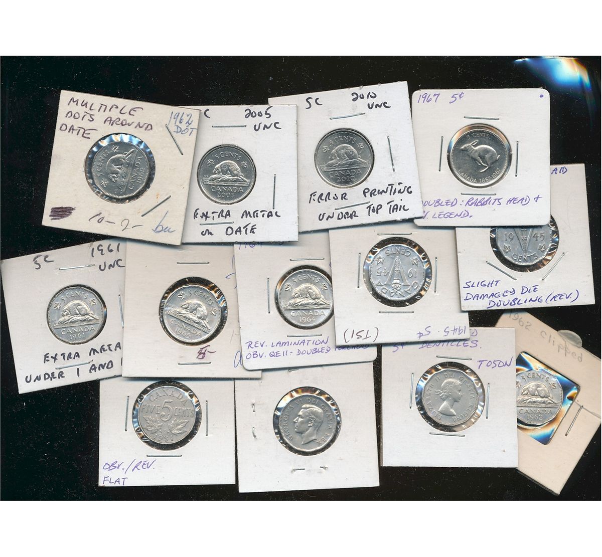 Variteties Lot; Large Lot of 300 x 5¢ issues with diverse varieties & errors. Mainly 1942 to 1970's issues with a few exceptions. Coins come in 2x2's with identification of variety. An interesting lot that should definitely be viewed.